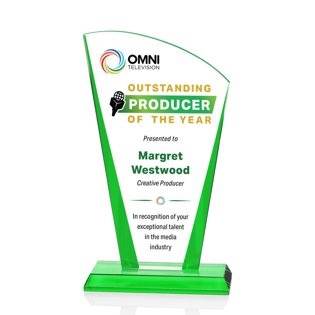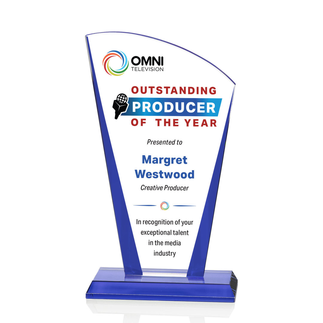 Striking Starfire Crystal Lola VividPrint™ Award features a tapered and curved top, enhanced with a beautiful bevel and propped between two blocks of colored crystal for an stunning recognition piece to honor a special achievement. 4.0″ W x 5.75″ H