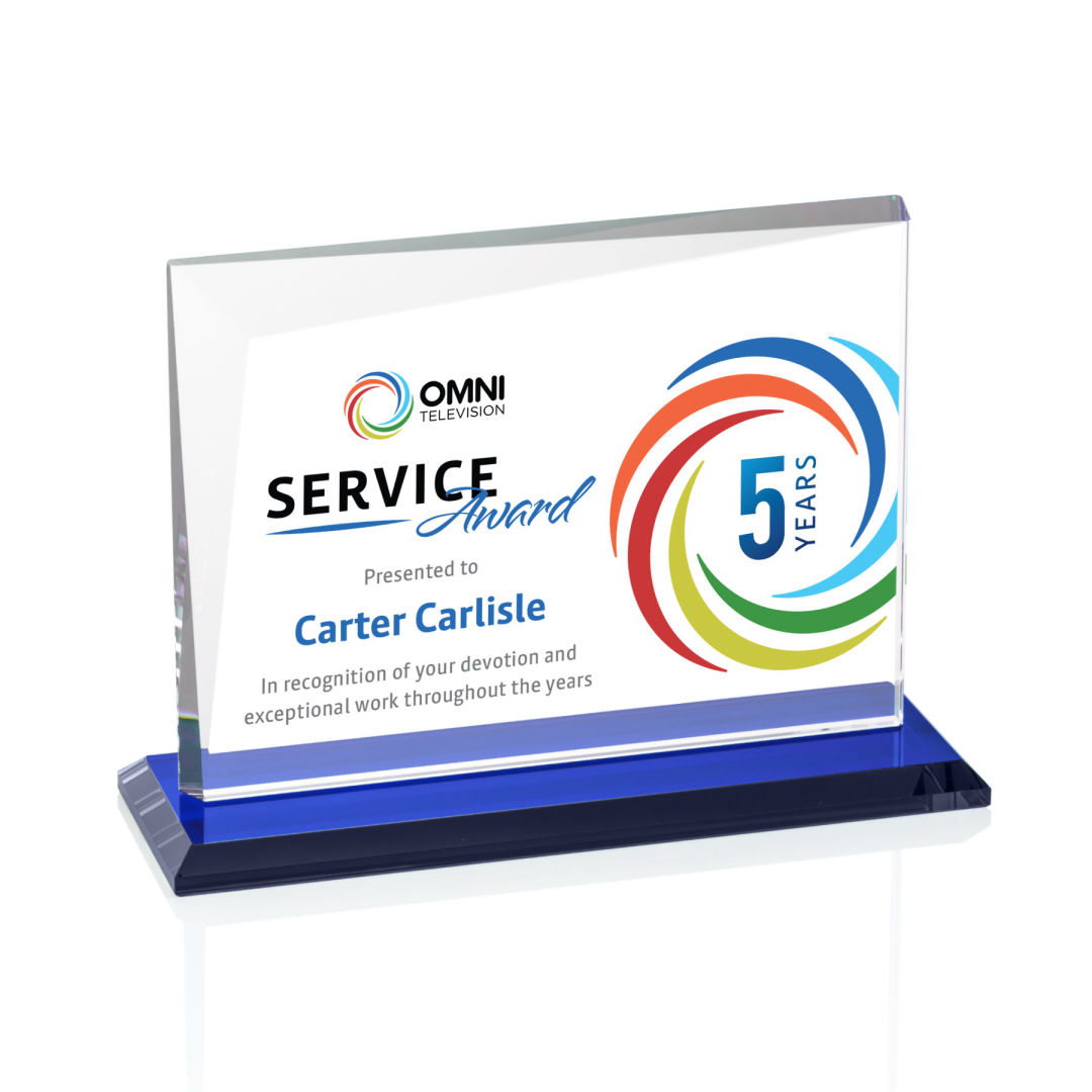 The Optical Crystal Mantella Star VividPrint™ Award features a sleek tapered rectangle design accented by a brilliant chrome or gold star at the top. Mounted on a clear oval optical crystal base, this award radiates prestige and celebrates stellar achievement. Bring your artwork to new heights with full-color VividPrint™! 3.625″ W x 7.5″ H x 2.75″ D