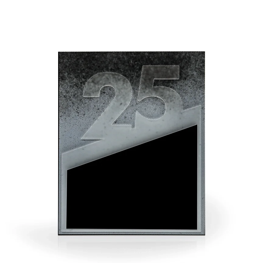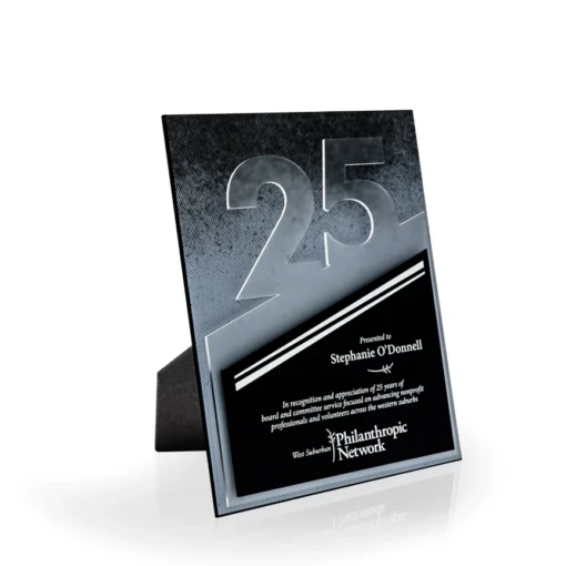 The 25 Year Flow Award Plaque is a black acrylic plaque with custom cut frosted and black acrylic panels attached to the front. This is a unique and budget friendly option for your years of service awards program. This plaque is a standard wall size that measures 8″ x 10″. The 25 Year Flow Plaque is designed to hang vertically but also has an easel on the back for tabletop display. 10″ H x 8″ W x 3/4″ D