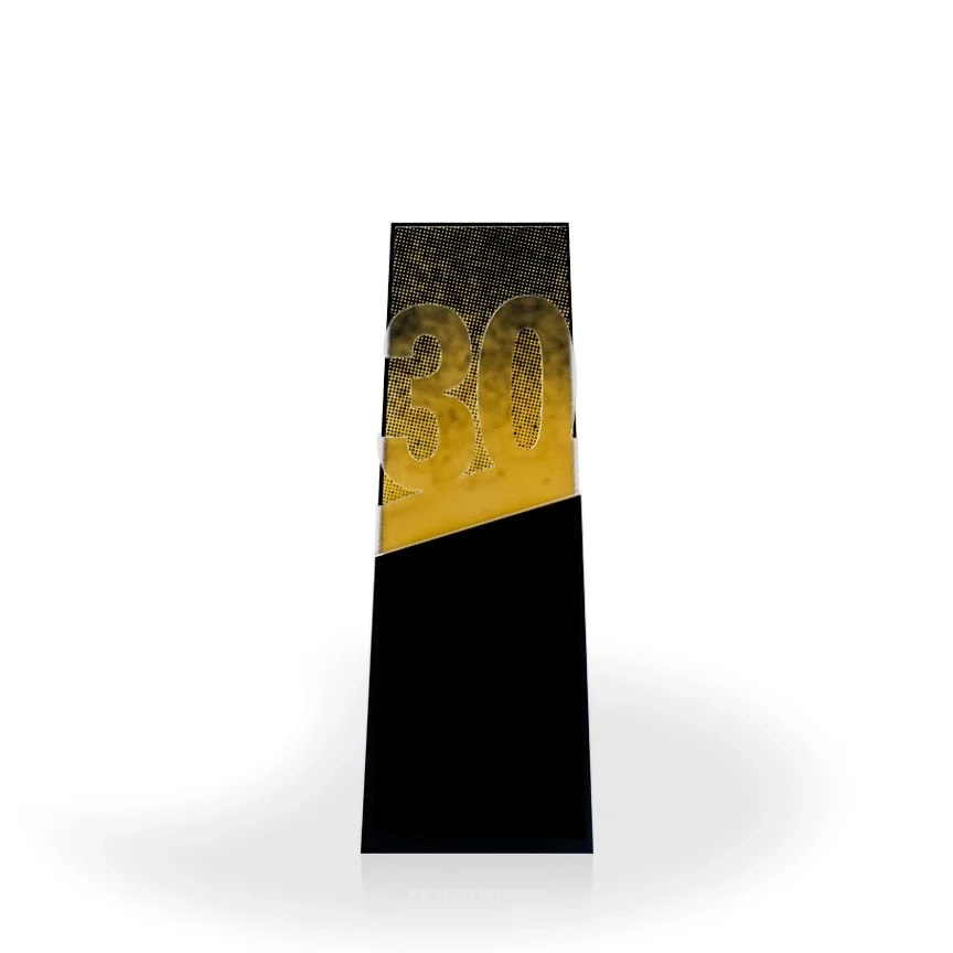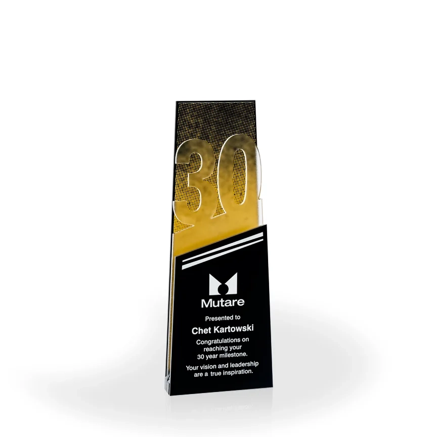 The 30 Flow Acrylic Desktop Award is a freestanding award that stands at 9″ tall and is comprised of layers of black and frosted. This is a unique and budget friendly option for every awards program. The 30 Flow Acrylic Desktop Award is a great choice for recognizing years of service in sales, management, leadership, customer service and more. This award is sure to make a lasting impression when presented to the recipient. 9″ H x 3.375″ W x 3/4″ D