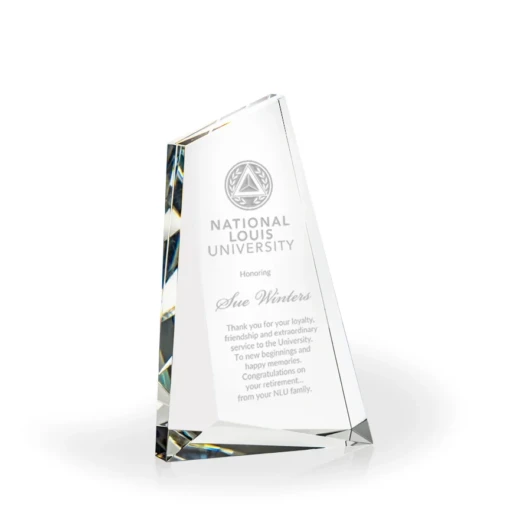 The Acme Crystal Award is a gorgeous flawless optic crystal award. It is a fabulous option when you want to recognize outstanding performance, contributions, or commemorate a special event or occasion.Most often this award is engraved to stand vertically, evoking the look of mountain peak, a boat sail, or summit. It can also be engraved horizontally when your logo or text requires more horizontal space. 8.75″ H x 5.25″ W x 2″ D