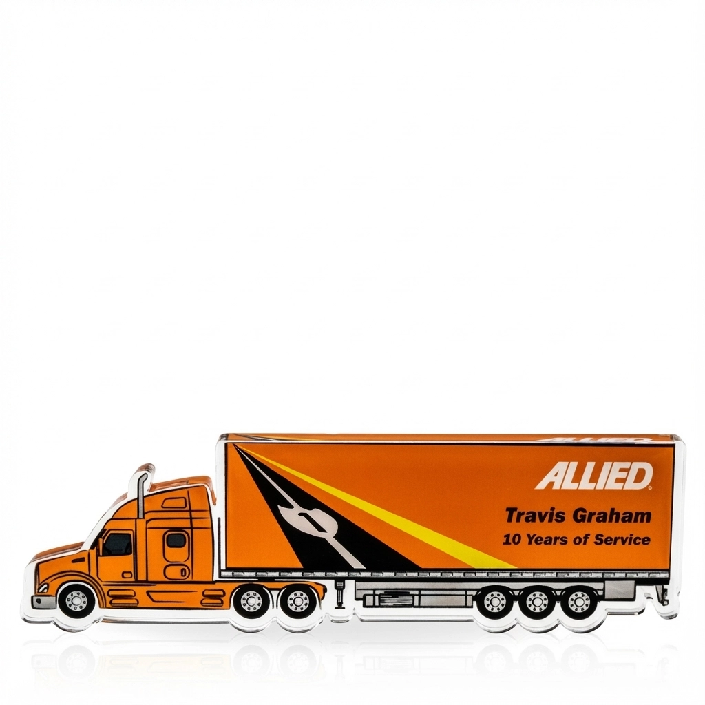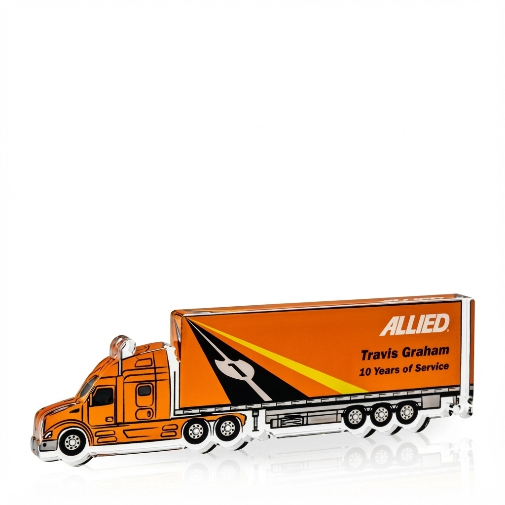 Perfect for corporate recognition in transportation and logistics, this acrylic semi-truck award suits employee milestones, safe driving honors, or industry achievements. It also works for sports team recognitions with a trucking theme, academic awards in vocational programs, or general business presentations.