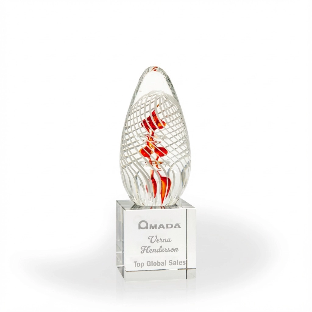 Celebrate excellence with the Ada Art Glass Award, a breathtaking piece designed to honor extraordinary accomplishments. Each award is meticulously handcrafted from premium art glass, showcasing a harmonious blend of form and color that captivates the eye. The dynamic, sculpted glass body rests elegantly atop a rich, crimson red base, creating a stunning contrast that commands attention and imbues the piece with a sense of passionate achievement. This exquisite award is not merely a trophy; it is a work of art, reflecting the dedication, innovation, and triumph of its recipient.