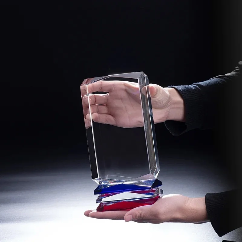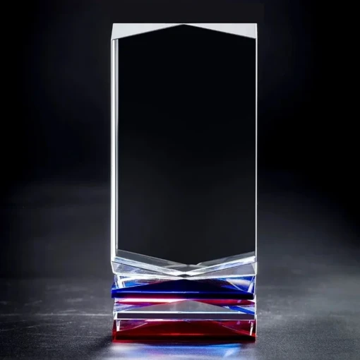 The Alexandria Award features a clear Optic Crystal faceted block that is bonded to a triple layer base of blue, clear and red Optic Crystal. This heavy award has a large engraving area that is suitable for either abrasive etching or sub surface laser engraving. The Alexandria Award comes in a premium quality Black presentation box. 9″ H x 4″ W x 2.4″ D