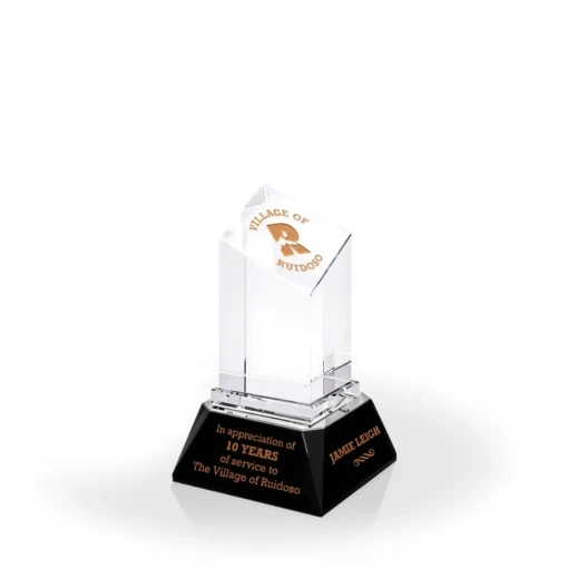 The Allotrope Crystal Award is a majestic award, perfect for top performers, and special recognition of outstanding performance. It is very popular for Chairman’s award, President’s Circle, Top Sales Producer, Employee of the Year award, and management awards. The upper column on the award is clear optic crystal which is affixed to a black glass square on top of a black optic crystal base. The award is available in three sizes; 7″, 9″ and 11″ tall. Color fill choices are gold, silver or bronze. 7″ H x 4.5″ W x 4.5″ D