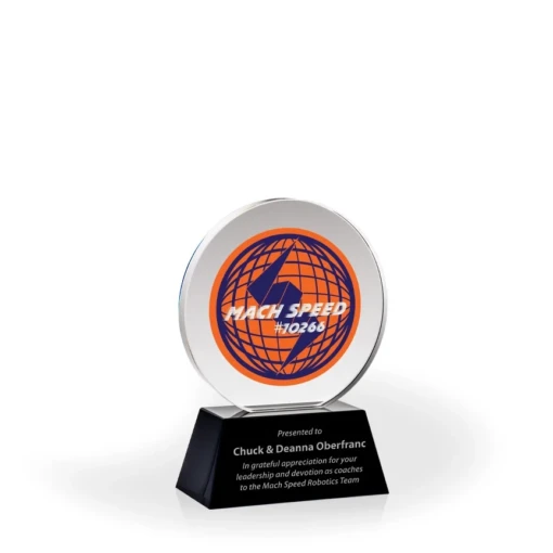 The versatile Angelique Crystal Award is a great option for recognizing many different levels of achievement in your organization. The flawless, clear optic crystal circle Can be either engraved or UV printed with brand and award information. 6.875″ H x 4.5″ W x 2.5″ D