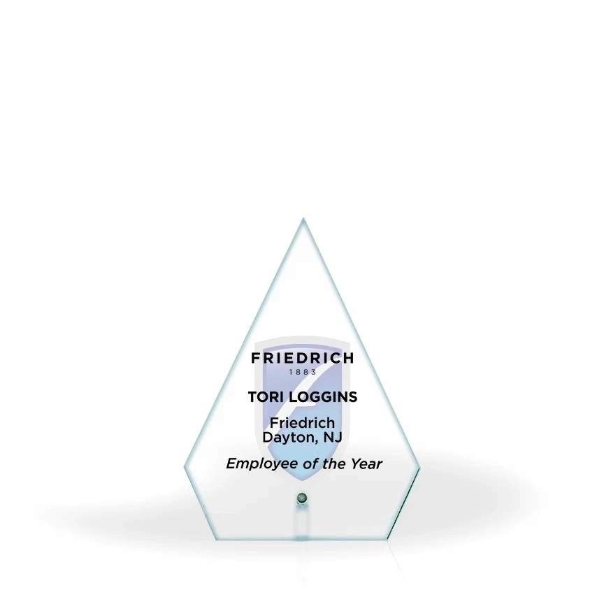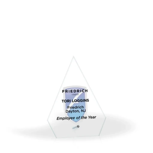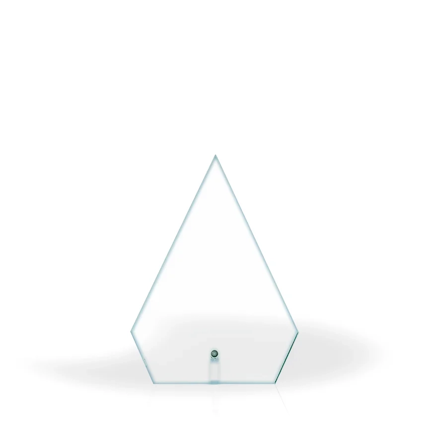 Simple, yet elegant, the Annette Glass Award features a crystal clear, arrow shaped glass panel, set with a silver finish metal pin to ensure it sits sturdily atop any desk or tabletop. The shape of the 1/4″ glass panel offers a good amount of space for engraving award title, recipient name, and other important information. The Annette Glass Award is perfect for recognition of any type or level of achievement in the workplace or organization. 7.125″ H x 5.125″ W x 0.25″ D