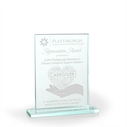 Crafted from high-quality jade glass, the Applause Jade Glass Award features a striking rectangular plaque design with polished edges and intricate frosted elements. The jade glass material offers a subtle green tint and smooth surface ideal for showcasing custom engravings. Its geometric shape provides a modern look suitable for various recognition needs.