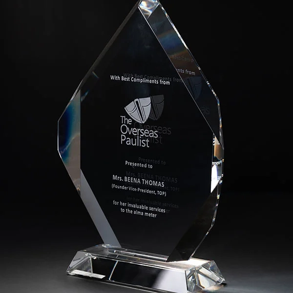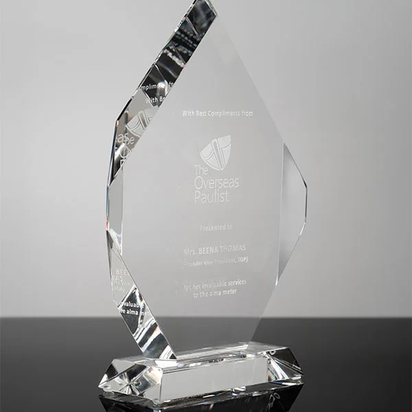 The Ariana Diamond Award in Clear Optic Crystal features front and reverse steep bevels that reflect light from almost any angle. It is mounted to a mitered clear Optic Crystal Base and is currently available in three sizes. Each Ariana Diamond Award is shipped in a premium quality presentation box. 6.5″ H x 4.5″ W x 2″ D