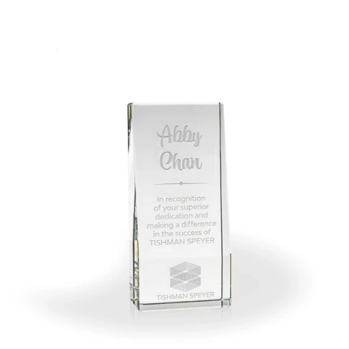 The perfect choice for recognizing significant achievements and milestones, the Astor Crystal Award features a diagonal, slanted tower shape, and is made from brilliantly clear optic crystal. This classic and elegant award is free standing, with its stout base, which gives it somewhat of a contemporary look. The Astor Crystal Award stands at 9″ tall, and is a stunning piece that any recipient would be proud to showcase in their workplace lobby, in the office, or in the home. 8″ H x 3.5″ W x 2″ D