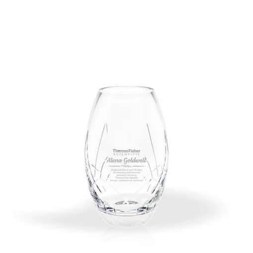 The Atticus Crystal Vase is stunning and makes a perfect award or corporate gift to commemorate single recipients or corporate teams in the workplace. This classic looking, brilliant vase is available in 3 sizes 7″, 9-1/4″ and 12″ . The perfect sizes for displaying in home or office, on your desk or table, especially holding fresh cut flowers. This heavy crystal vase features beautifully cut facets and a space for engraving names, dates, logos or gift/award information. 6.875″ H x 4.375″ W x 4.375″ D