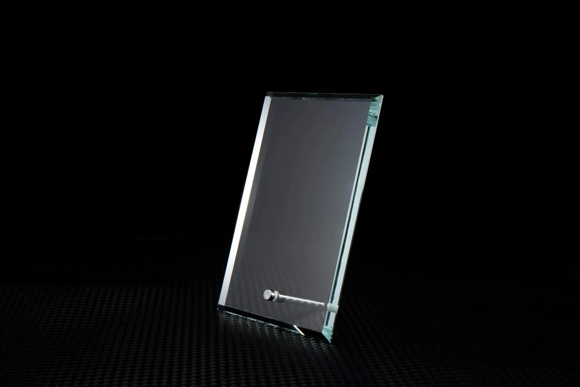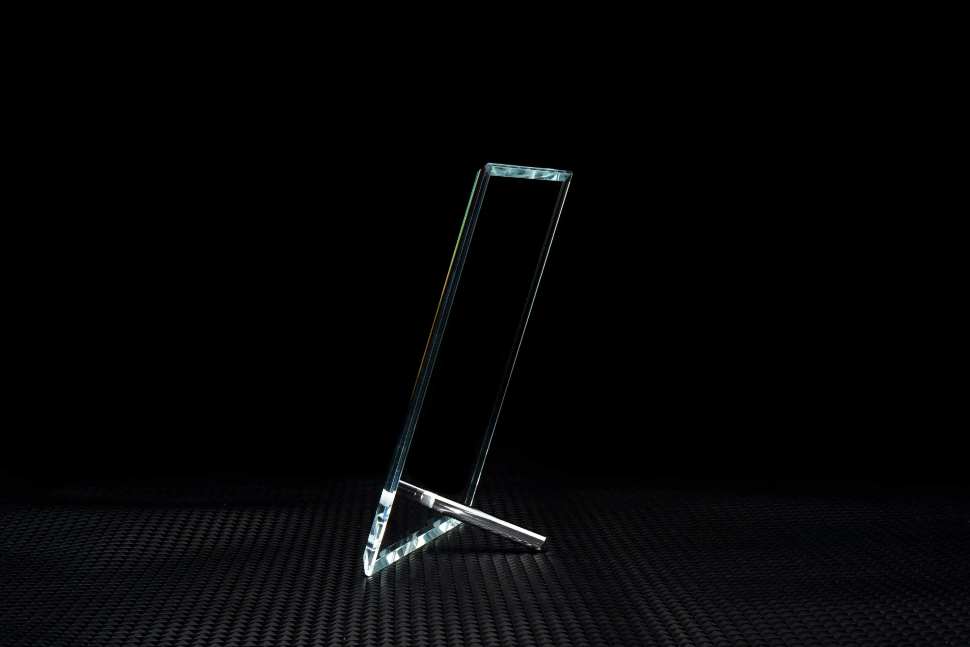 The Aurora Portrait features 1/4″ (6mm) thick Crystal Clear Glass that is perfect for abrasive etching, Co2 Laser engraving, sub surface laser engraving, or UV printing. Each Aurora has either a highly polished edge or steep beveled edges that sparkle. These economical products are very budget friendly. 4″ L x 0.2″ W x 6″ H