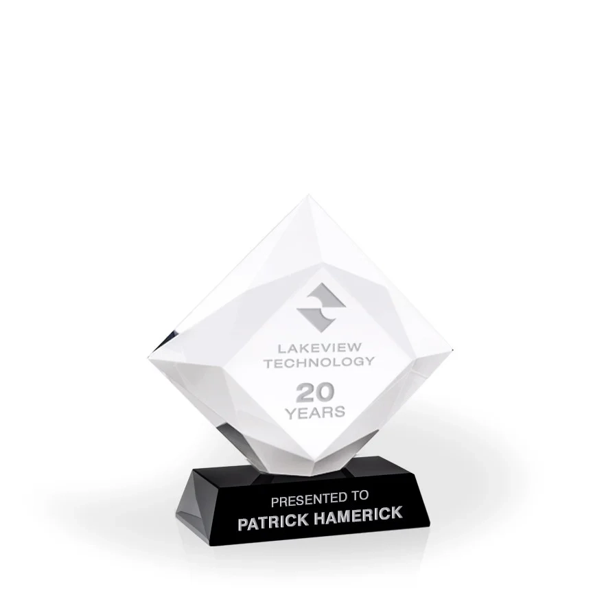 The Avior Crystal Award is the perfect option when you need to commemorate different levels of achievement that are special to your organization. The flawless, clear optic crystal is cut with faceted edges into a square shape and affixed to a customized black base. 7.1875″ H x 7″ W x 2.75″ D