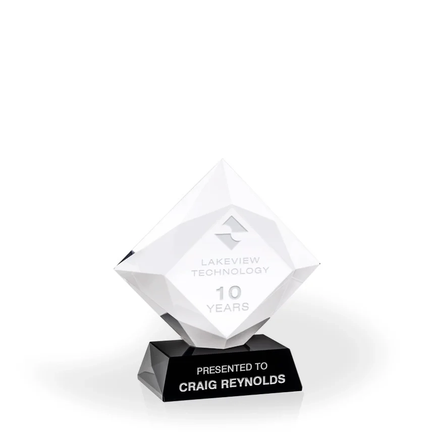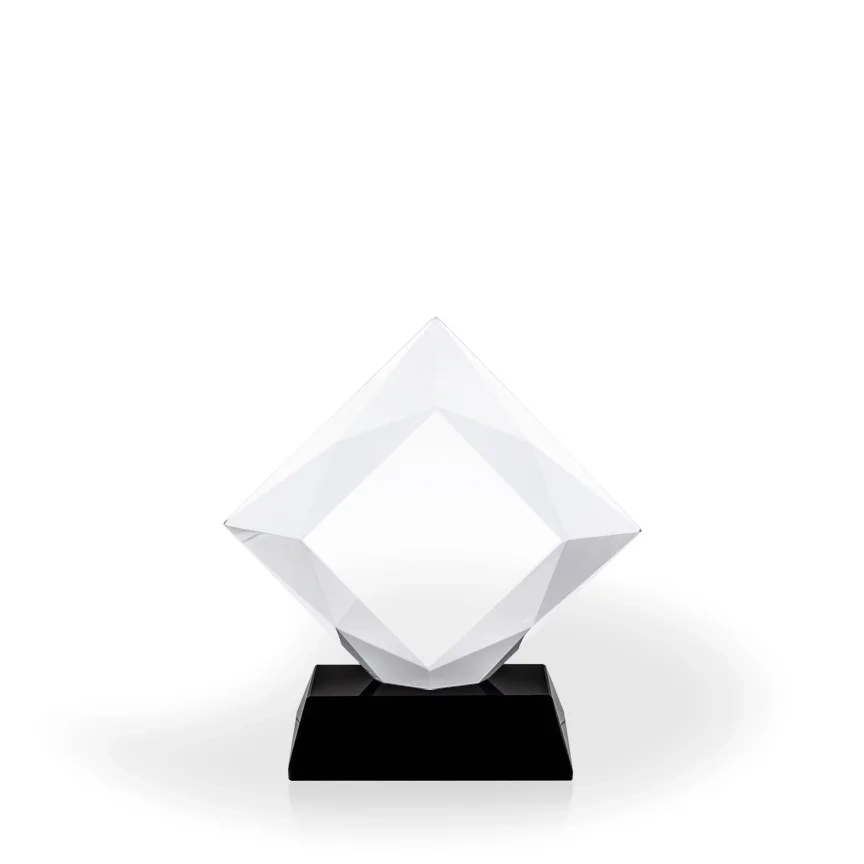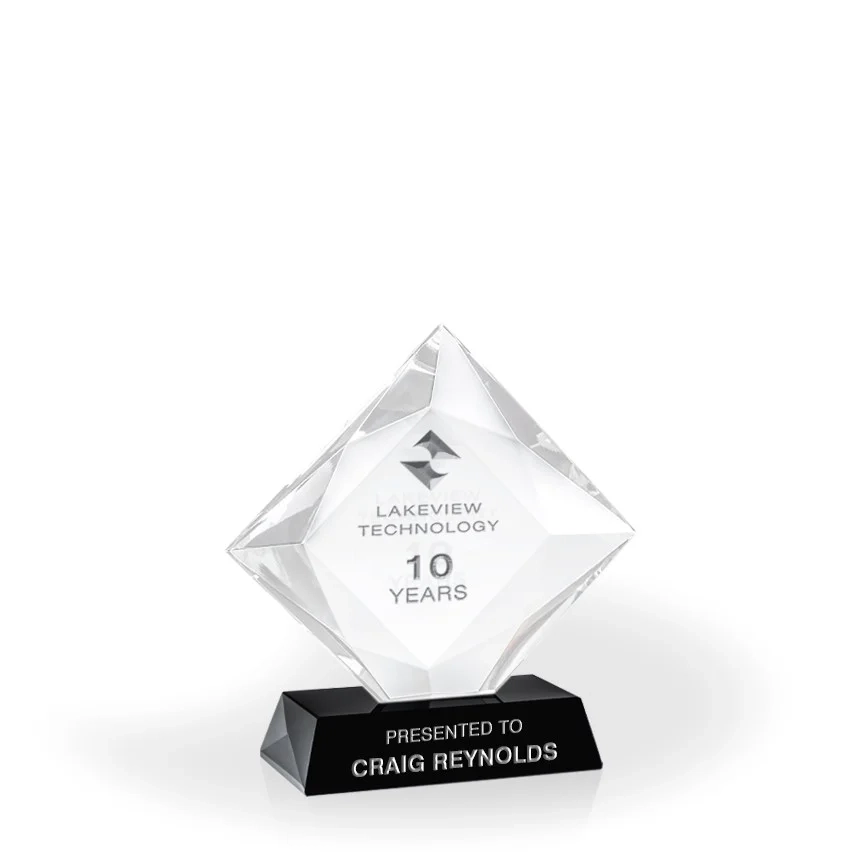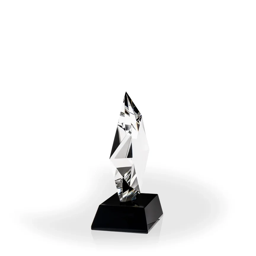 The Avior Crystal Award is the perfect option when you need to commemorate different levels of achievement that are special to your organization. The flawless, clear optic crystal is cut with faceted edges into a square shape and affixed to a customized black base. 5.9843″ H x 5.657″ W x 2.5″ D