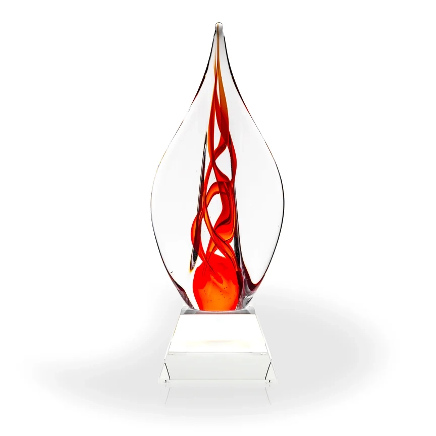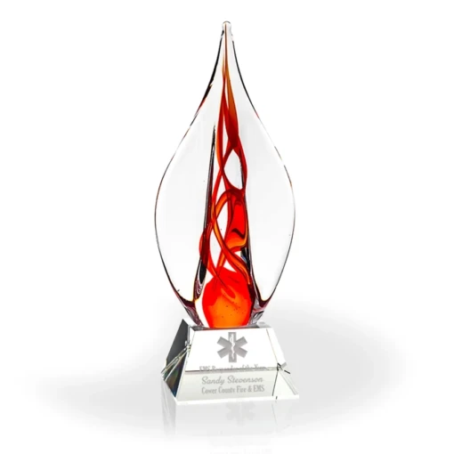 This beautiful Avondale Art Glass Award is a favorite for many award events. It features a vibrant red and orange hued flame on a clear crystal base. Art glass awards are hand blown, and each piece will be slightly different in color, shape, and size. Bubbles and swirls are a part of the process and are considered normal and acceptable. 14.5″ H x 5.5″ W x 4.5″ D