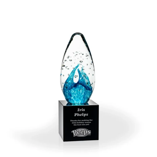 The Besly Art Glass Award is a fun award when you want something whimsical and bright. This award has a blue and teal splash on the inside of the egg shaped glass, and sits atop a black crystal base. The crystal base is engraved and color filled in silver. Art glass awards are hand blown, and each piece will be slightly different in color, shape, and size. Bubbles and swirls are a part of the process and are considered normal and acceptable. 9.5″ H x 3″ W x 3″ D