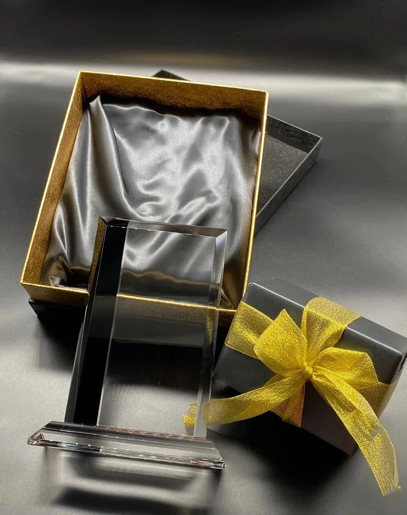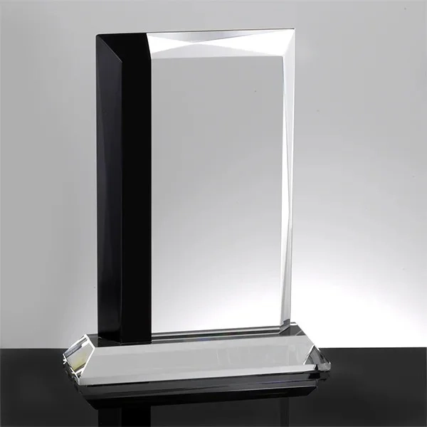 The Bethany Award features a dual combination of clear Optic Crystal with a black Optic Crystal strip mounted on a clear Optic Crystal base. At almost 9″ tall this heavy award has a large engraving area. The Bethany Award comes in a premium quality presentation box. This award is available as a blank for engravers, or if you prefer we can do the engraving for you. 8.8″ H x 6.7″ W x 2″ D