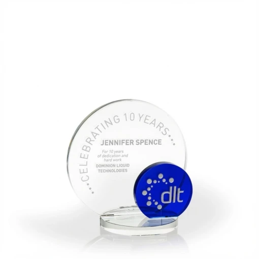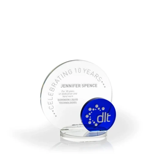 The Blue Moon Crystal Award is made of beautiful blue and clear optic crystal components. It is a fabulous option when you want to add an award to your program with a colorful component, or have red in your corporate color palette. The circular components work well if you have a logo or theme that is circular. At 6.25″ high, there is ample space to engrave your award text and information. 6.25″ H x 6.25″ W x 3.5″ D