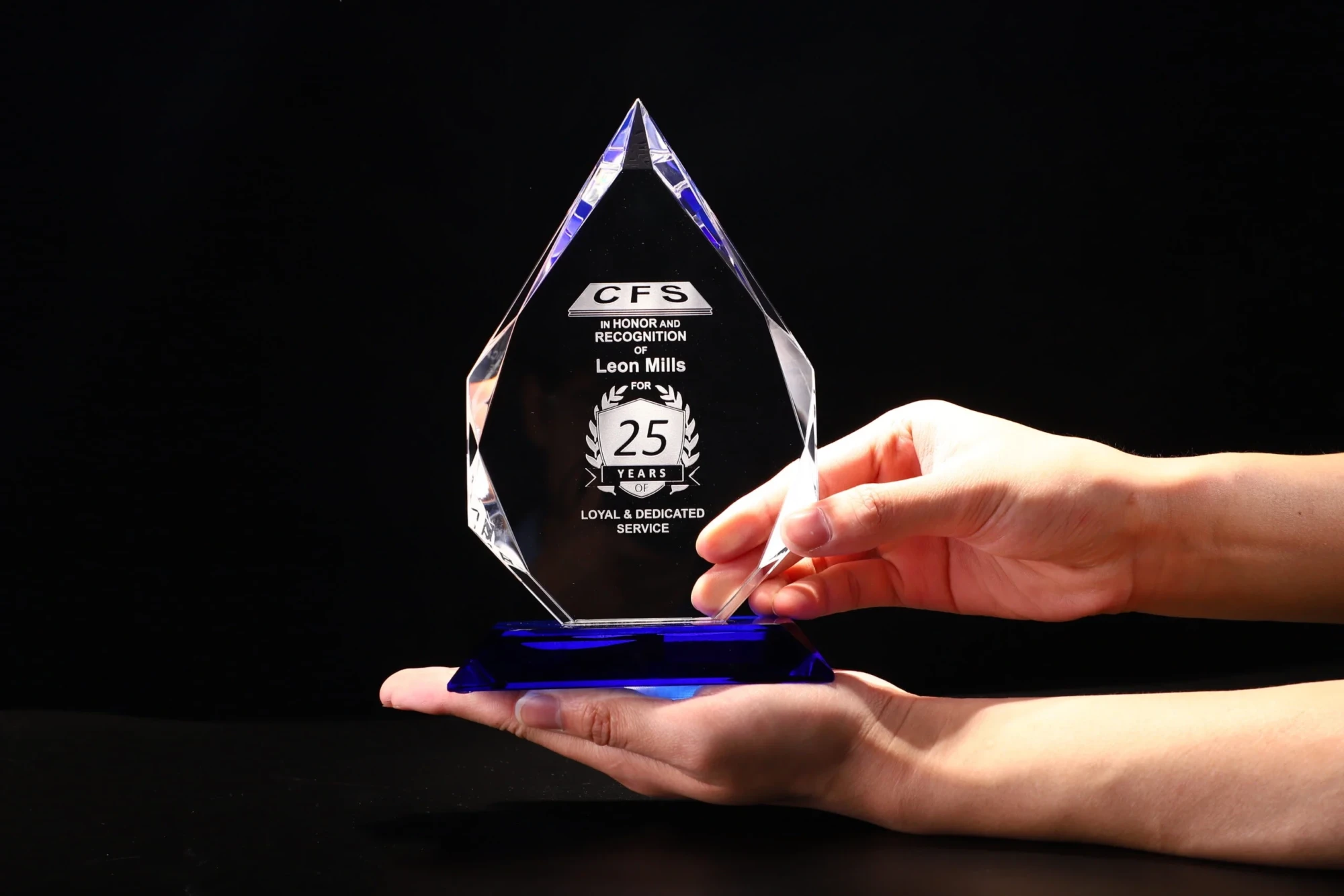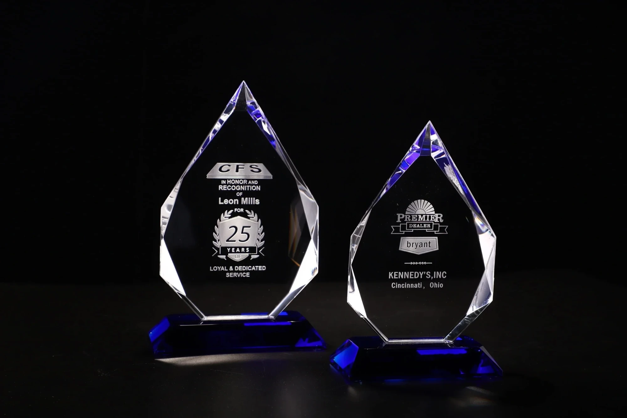 The Clear Optic Crystal “Bluetricet” Award is mounted to a Blue Optic Crystal Base. This classic diamond shape with its multiple bevels and facets reflects light from every angle. Each Bluetricet Award is shipped in a premium quality presentation box. These awards are available as a blank for engravers, or if you prefer we can do the engraving for you. 6.9″ H x 4.3″ W x 0.6″ D