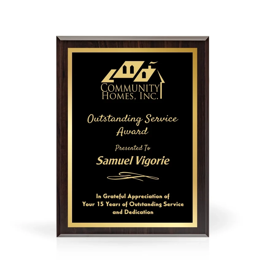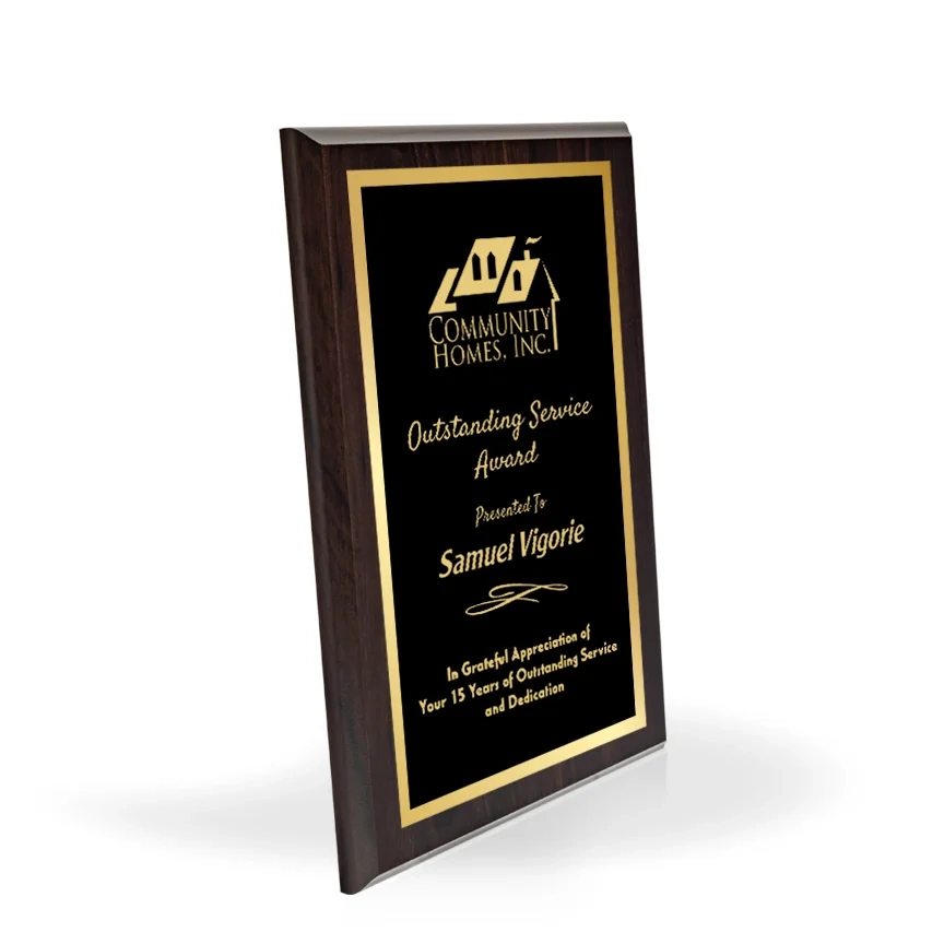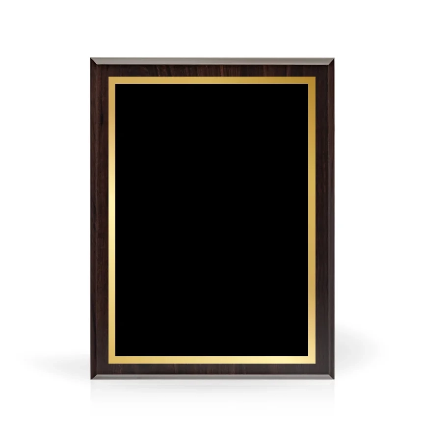 The Bordeaux Wood Plaque features a deep cherry wood finish, with a gold trimmed black top plate that will engrave to gold. This plaque can be engraved to hang vertically or horizontally and features a keyhole in the back for hanging. 12″ H x 9″ W x 1″ D