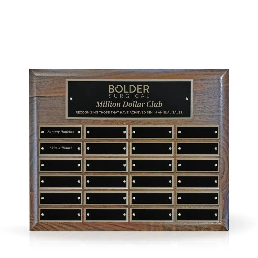The Briarwood Walnut Perpetual Plaque is the perfect plaque to recognize monthly, quarterly or yearly team or corporate achievements. The natural looking walnut plaque is available in both horizontal and vertical orientation: 10.5″ x 13″, and can hold 25 plates. The Briarwood Walnut Perpetual Plaque features a header plate that engraves in gold to feature company logos or achievement levels. Under the header plate, there are 24 additional gold trim nameplates. The header plate measures 8″ w x 2.5″ h.The gold metal perpetual plates measure 2.75″ w x 0.875″ h.NOTE: Published price includes decorated plaque, but DOES NOT include the 25 personalized plates. Prepay for all 25 plates at $20.00 (R) each, or pay for plates as needed for $25.00 (R) each. Plate prices include USPS shipping. 13″ H x 10.5″ W x 1″ D