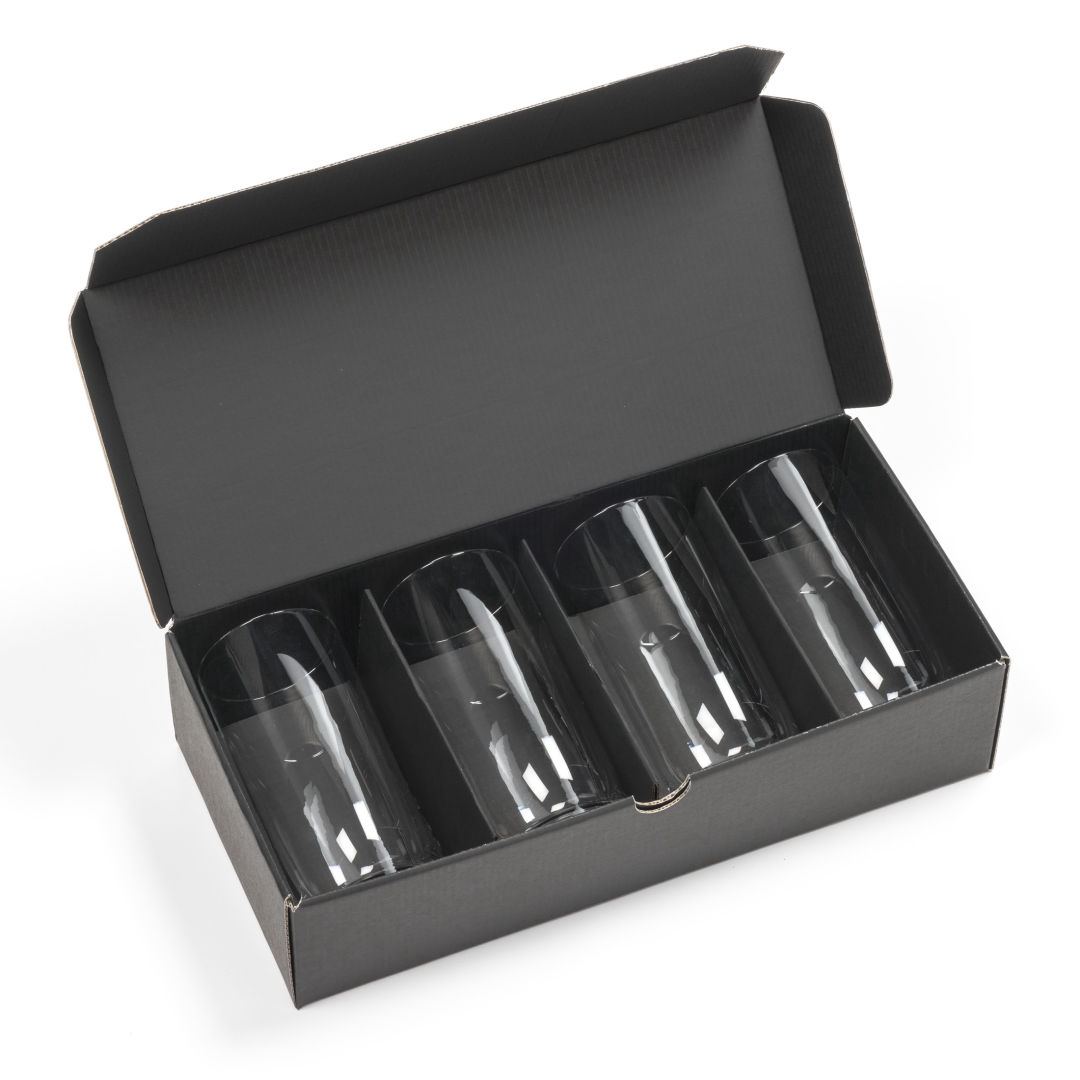 The Caldmore Crystalline Carafe Set. This set is paired with our Graydon 13.5oz Beverage Glass, features a unique, angular silhouette and enhances your presentation of beverages while capturing the delicate bouquet of flavors with its tapered lip. Includes a black satin lined gift box. Includes the 40oz Caldmore Carafe and your choice of 2 or 4 glasses.