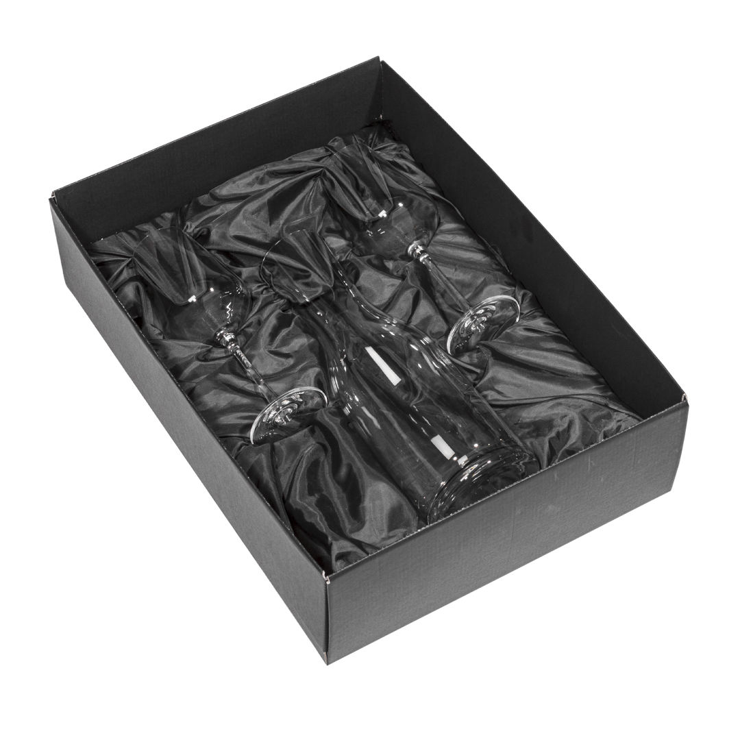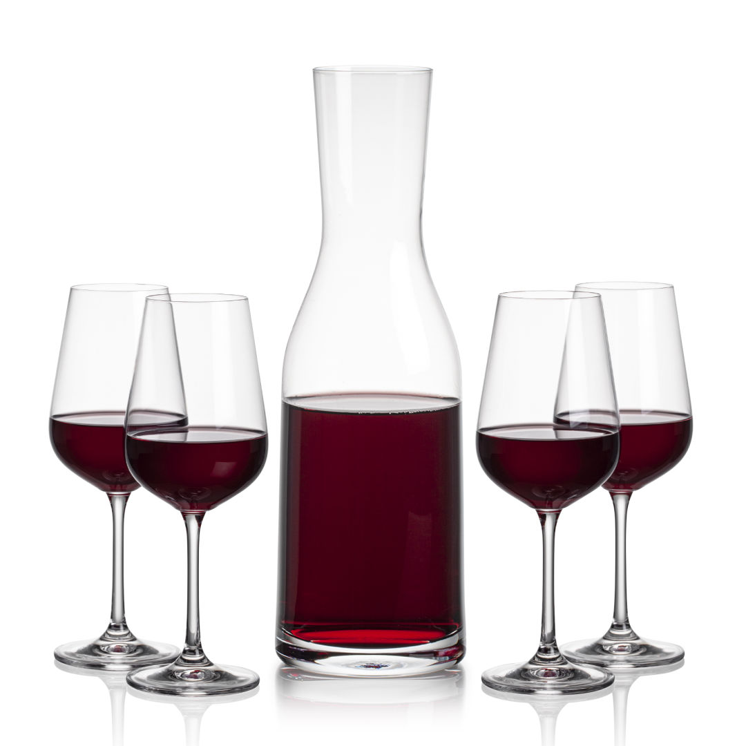 Express the full aromatic personality of your favorite wine with The Caldmore Crystalline Carafe Set. This set is paired with our Laurent 12oz Stemmed Wine Glass, perfect for either a full-bodied Cabernet or a light bodied Riesling. Includes a black satin lined gift box. Includes the 40oz Caldmore Carafe and your choice of 2 or 4 wine glasses.