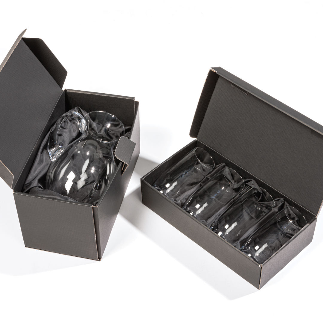Express the full aromatic personality of your favorite wine with The Caldmore Crystalline Carafe Set. This set is paired with our Reina 11.5oz Stemless Wine Glass, perfect for capturing the aromas by allowing a large surface of wine to meet the air. This set will be your go-to for any drink and any occasion. Includes a black satin lined gift box. Includes the 40oz Caldmore Carafe and your choice of 2 or 4 wine glasses.
