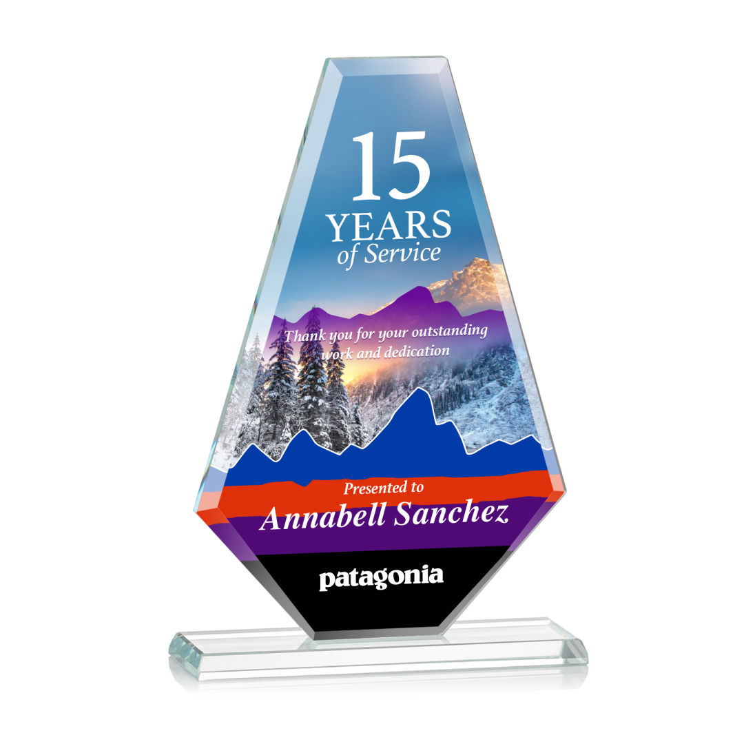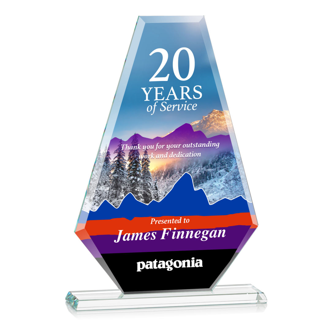 The perfection of Starfire Crystal Caldwell Award is in its symmetrical design, from its squared top which slants off on both ends outward into a beautiful dip at the base. Let your message POP with full color VividPrint! 4.75″ W x 7.75″ H x 0.375″ D