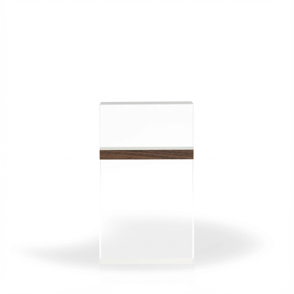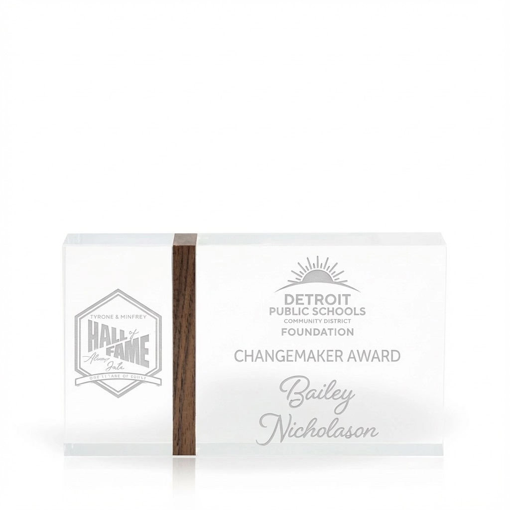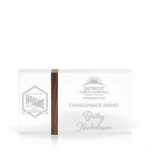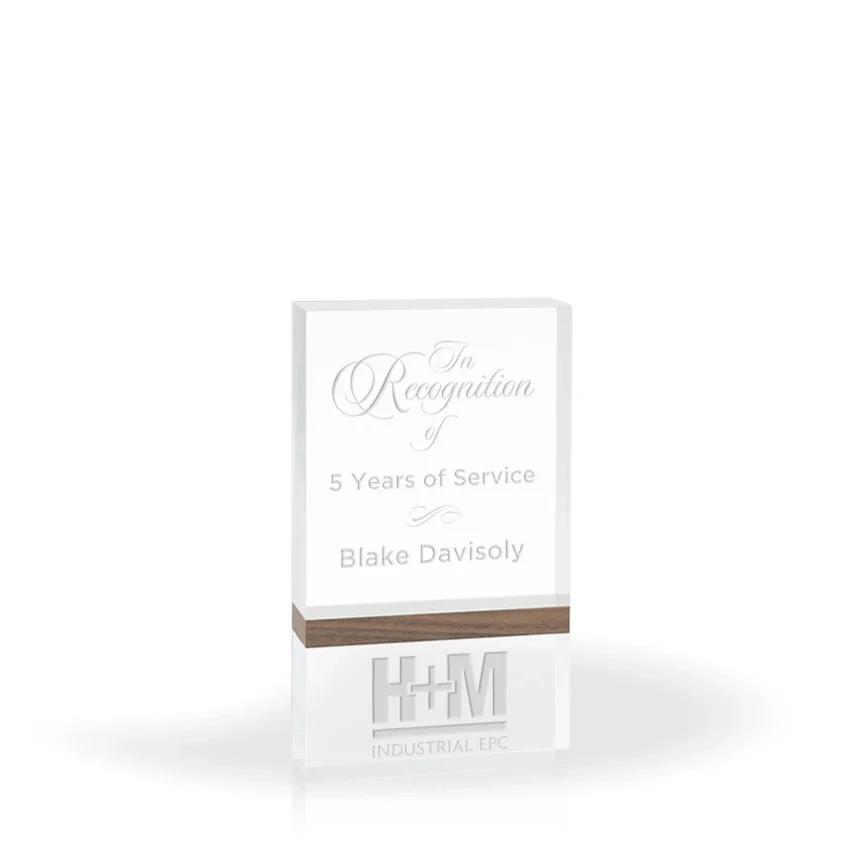 The Capri Walnut Accent Award is versatile while remaining an elegant desktop display of recognition. Made from brilliantly clear acrylic, the award features an accent made from walnut that is stained a rich brown. The Capri can be engraved in three different configurations, with the accent on top, or on bottom, or left side of the acrylic main body. 4″ H x 7″ W x 1.25″ D