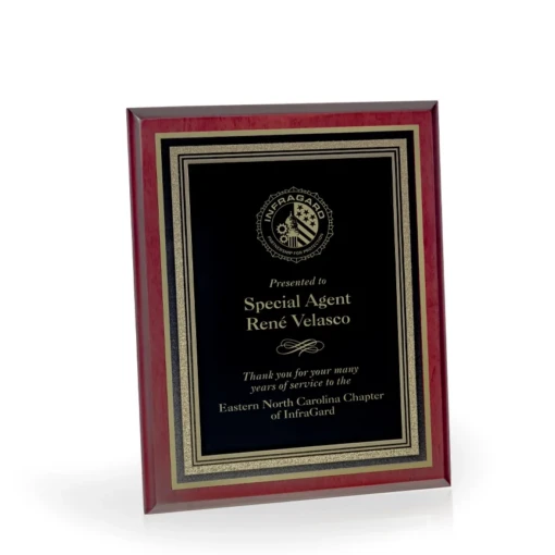 Recognize your employees’ contributions with the Carlos Mahogany Finish Award Plaques. These elegant plaques feature a black engraving plate on a textured back plate, with engraved gold letters that are accented by a textured border. The plaques are available in two sizes and can be hung either vertically or horizontally to suit your space and preference. 10″ H x 8″ W x 0.75″ D