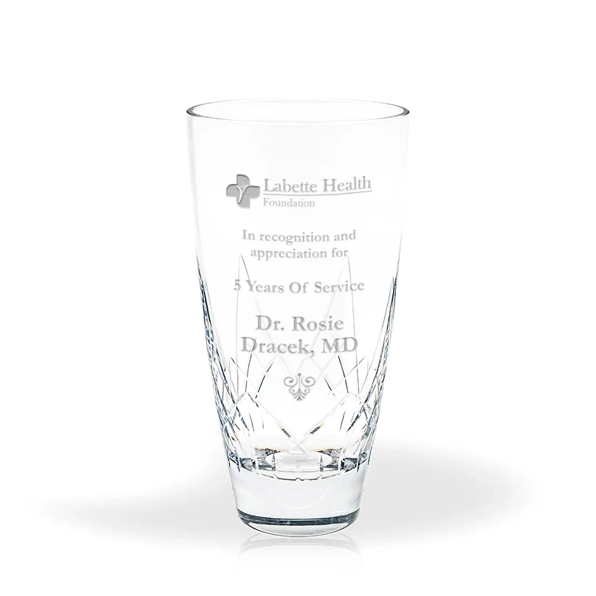 The Cassandra Crystal Vase is stunning and makes a perfect award or corporate gift to commemorate single recipients or corporate teams in the workplace. This classic looking, brilliant vase is available in 3 sizes 8″, 10″ and 12″ . The perfect sizes for displaying in home or office, on your desk or table, especially holding fresh cut flowers. This heavy crystal vase features beautifully cut facets and a space for engraving names, dates, logos or gift/award information. 10″ H x 5″ W x 5″ D