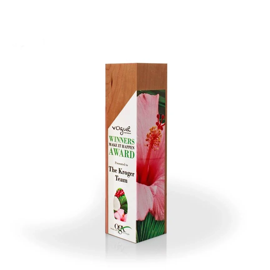 The Catalina family of wood awards are an excellent choice when looking for a more organic or natural design in your award program. These Full Color awards are made from solid cherry sourced in the USA, and are wrapped with a metal sheath that is decorated through sublimation in bright, colorful designs of your choice. The Catalina wood awards are available in three sizes, 9″, 7″, and 5″ tall to give you the option of creating multiple levels of awards. 5″ H x 2.25″ W x 2.25″ D
