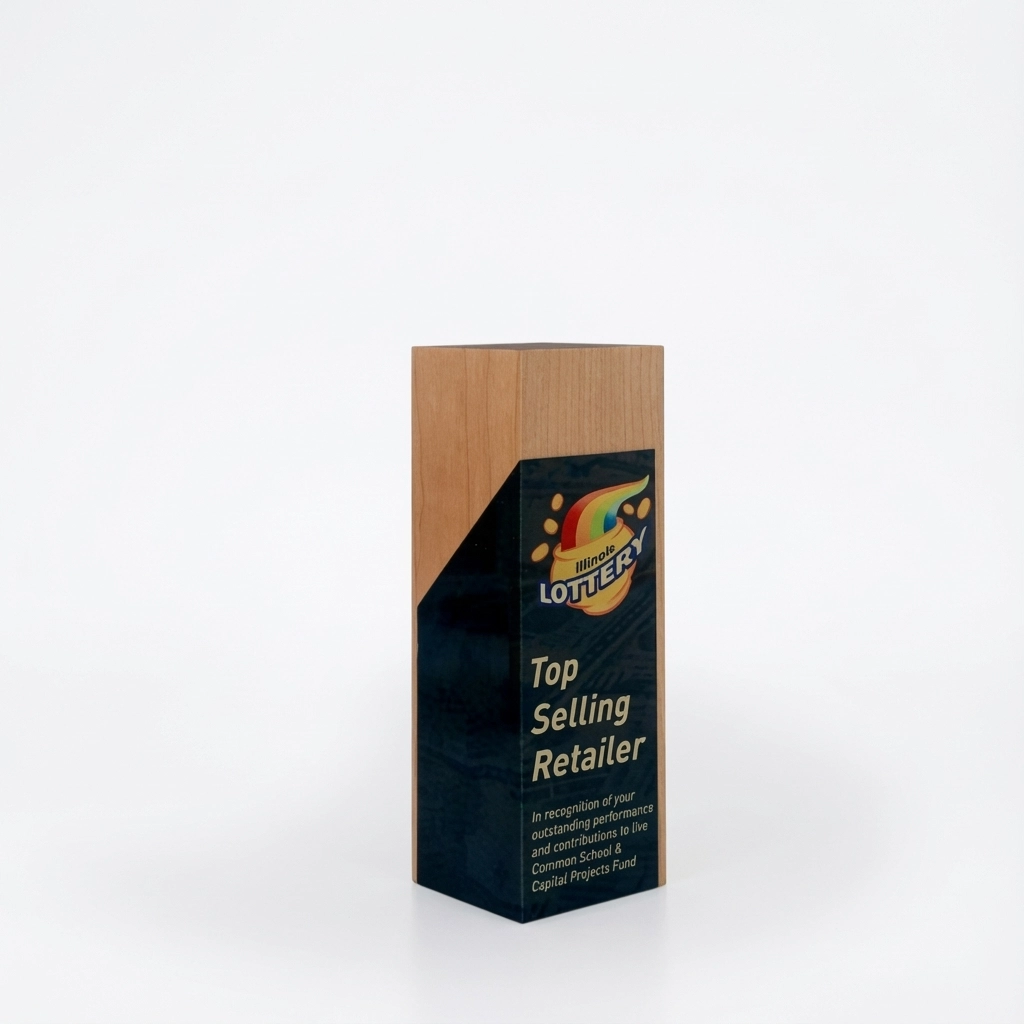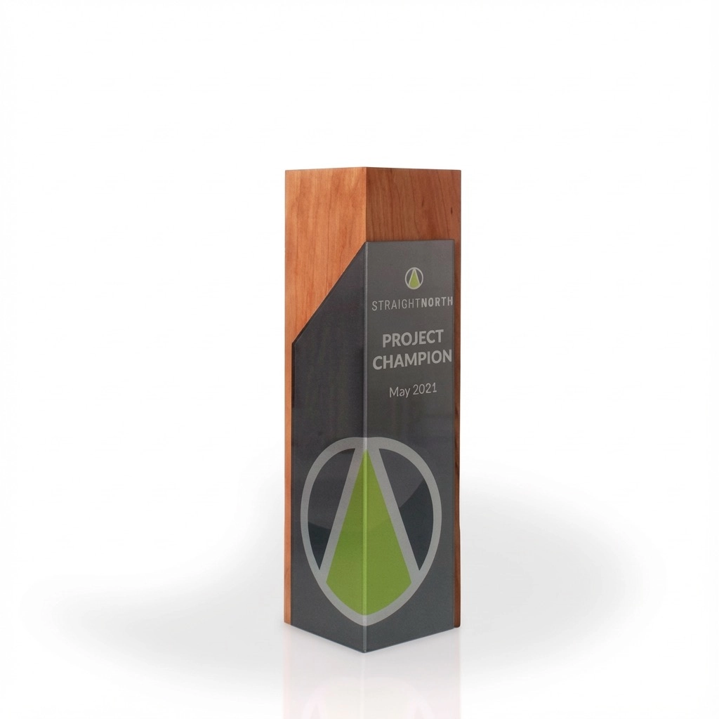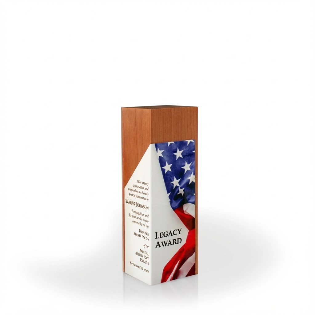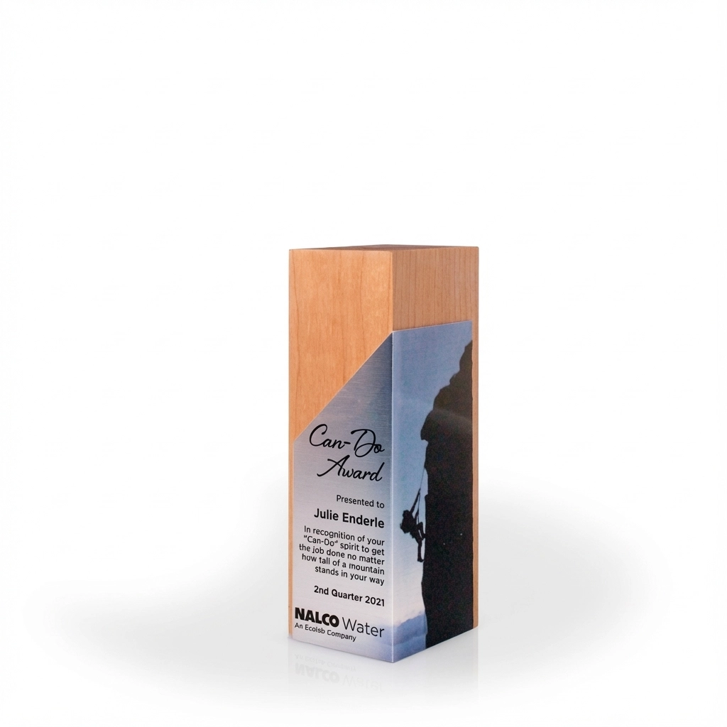 The Catalina family of wood awards are an excellent choice when looking for a more organic or natural design in your award program. These Full Color awards are made from solid cherry sourced in the USA, and are wrapped with a metal sheath that is decorated through sublimation in bright, colorful designs of your choice. The Catalina wood awards are available in three sizes, 9″, 7″, and 5″ tall to give you the option of creating multiple levels of awards. 5″ H x 2.25″ W x 2.25″ D
