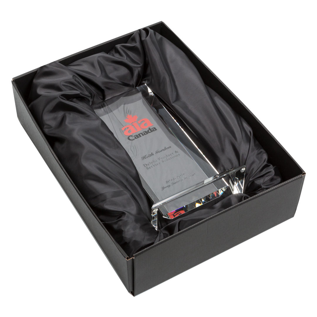 The striking diamond shaped Starfire Crystal Charlotte VividPrint™ Award is a magnificent recognition piece to celebrate a special achievement. Wedged between two panes of amber crystal, the Charlotte is a great choice for any corporate recognition programs. 4.5″ W x 5.75″ H