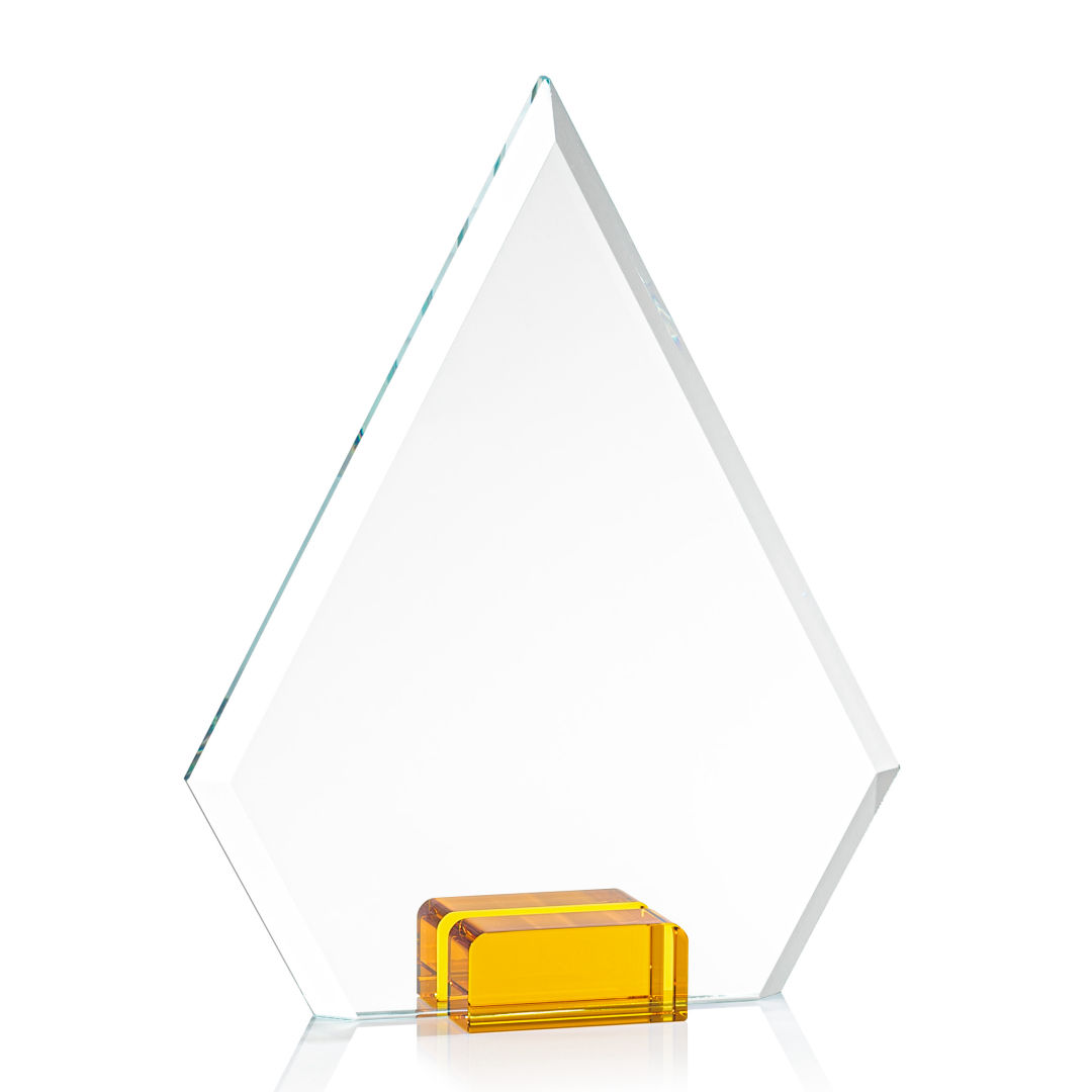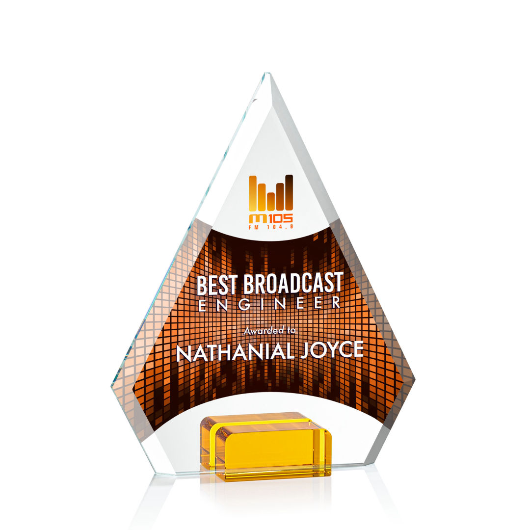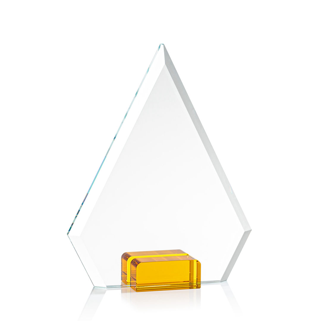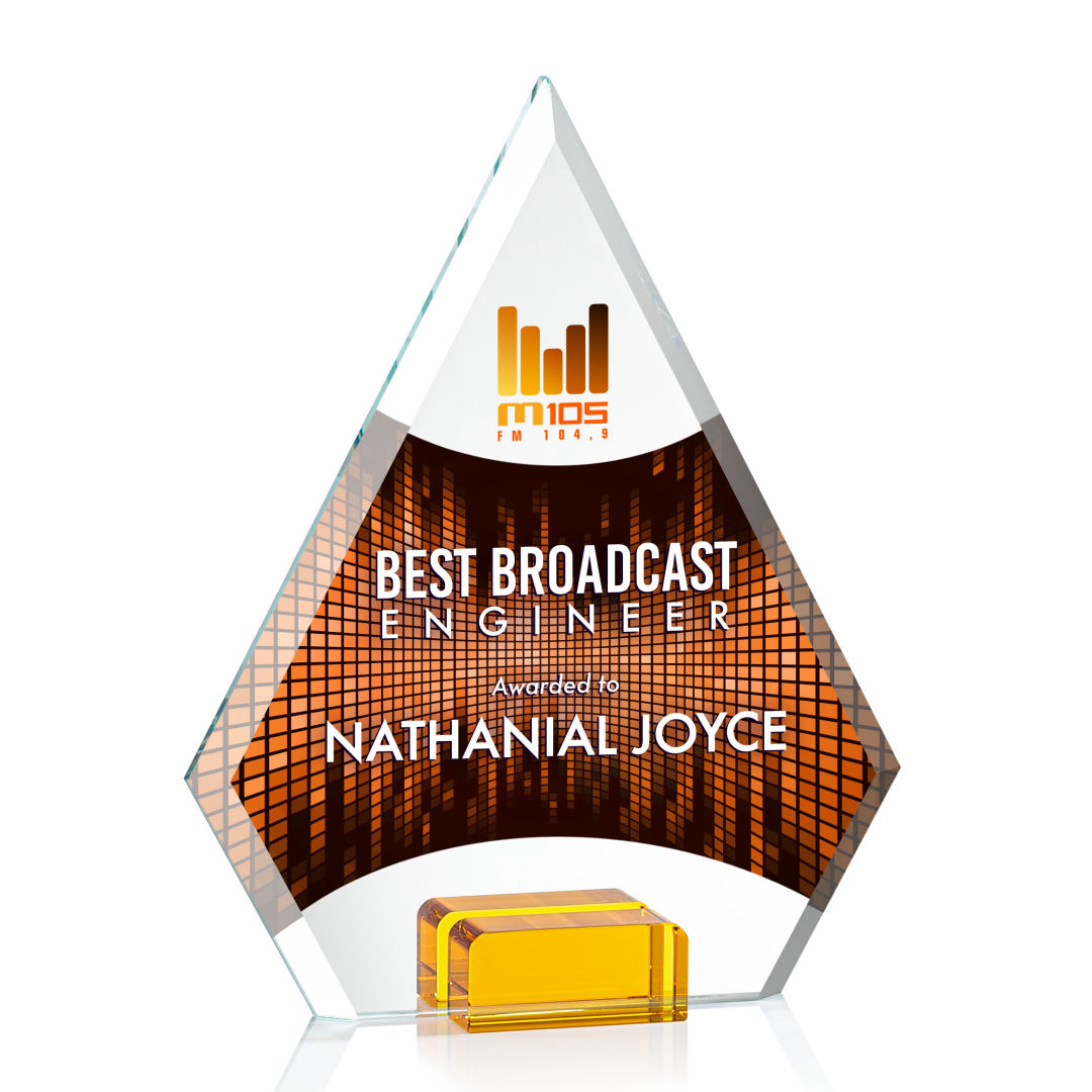 The striking diamond shaped Starfire Crystal Charlotte VividPrint™ Award is a magnificent recognition piece to celebrate a special achievement. Wedged between two panes of amber crystal, the Charlotte is a great choice for any corporate recognition programs. 4.5″ W x 5.75″ H