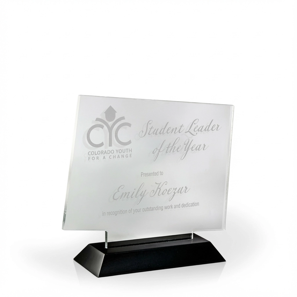 An attractive and affordable award option, our acrylic cutout awards are made in the USA with 1/4″ clear acrylic and a black, beveled wood base. These budget-friendly awards require minor assembly. The acrylic pop-in and wood base are packaged together, un-attached, in a slim-line white tri-fold box. 6.625″ H x 7.5″ W x 2″ D