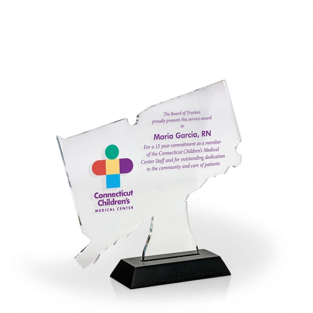 An attractive and affordable award option, our acrylic cutout awards are made in the USA with 1/4″ clear acrylic and a black, beveled wood base. These budget-friendly awards require minor assembly. The acrylic pop-in and wood base are packaged together, un-attached, in a slim-line white tri-fold box. 7.8″ H x 7.9″ W x 2″ D