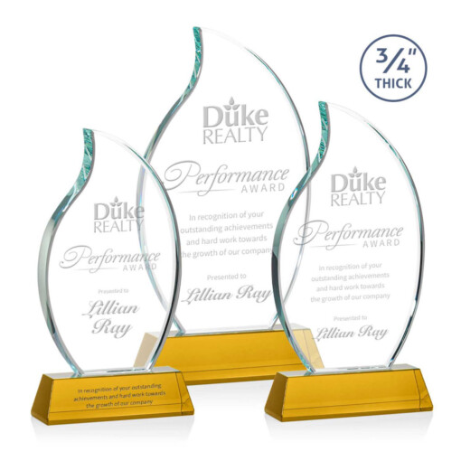 The Croydon award features an elegant 3/4″ thick Starfire Crystal flame to commemorate your achievement with an eternal symbol of greatness. Mounted on your choice of 8 sparkling colored Newhaven bases. Second position etch optional. 4.0″ W x 8.0″ H x 2.0″ D