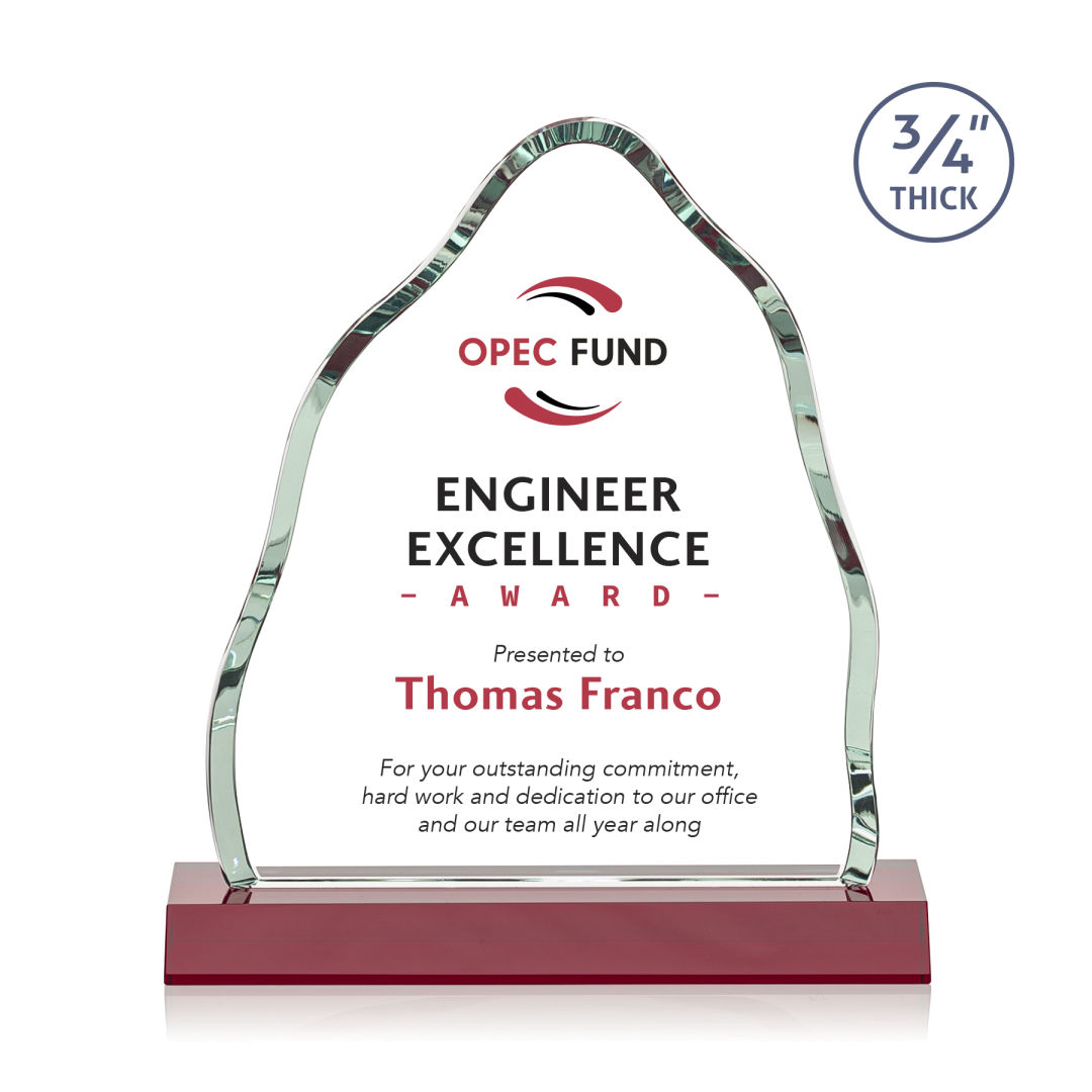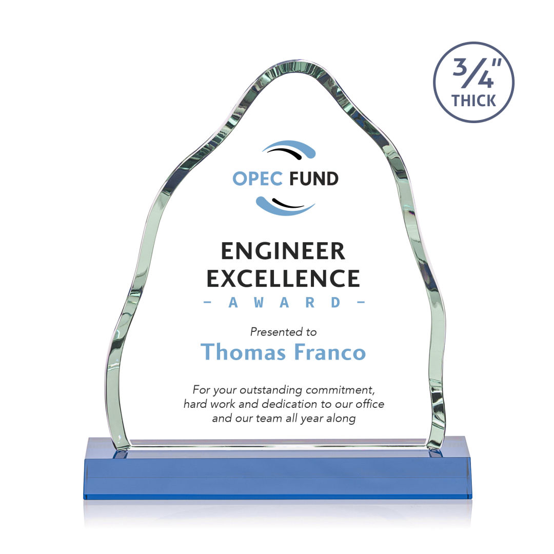 This illustrious Starfire Crystal award stands upright on an elegant Sky Blue base and is adorned with a Silver star for optimal view. The perfect recognition piece for a star performer. Also available with Gold star. 3.0″ W x 5.0″ H x 0.375″ D