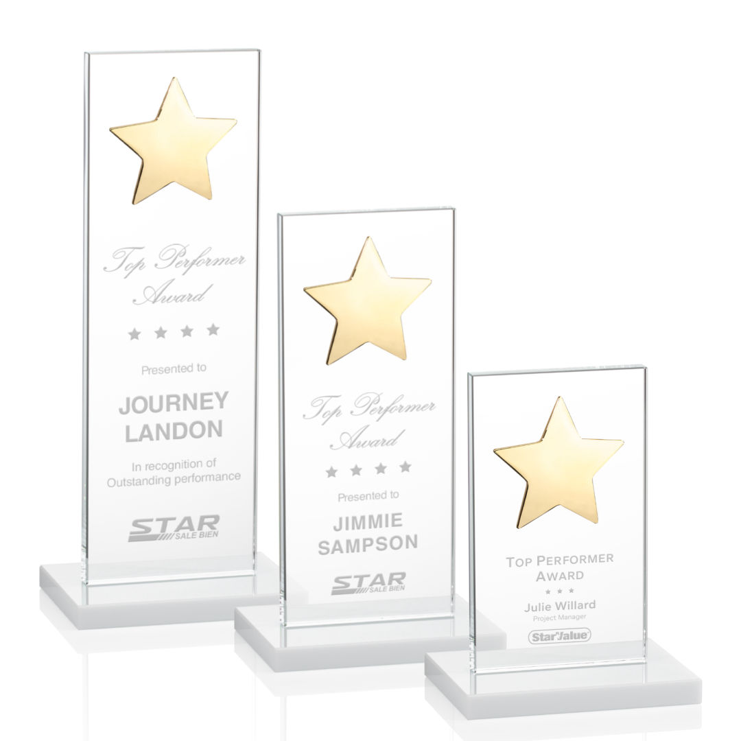 This illustrious Starfire Crystal award stands upright on an elegant White base and is adorned with a Gold star for optimal view. The perfect recognition piece for a star performer. Also available with Silver star. 3.0″ W x 5.0″ H x 0.375″ D