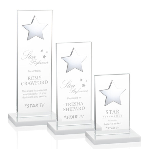 This illustrious Starfire Crystal award stands upright on an elegant White base and is adorned with a Silver star for optimal view. The perfect recognition piece for a star performer. Also available with Gold star. 3.0″ W x 5.0″ H x 0.375″ D