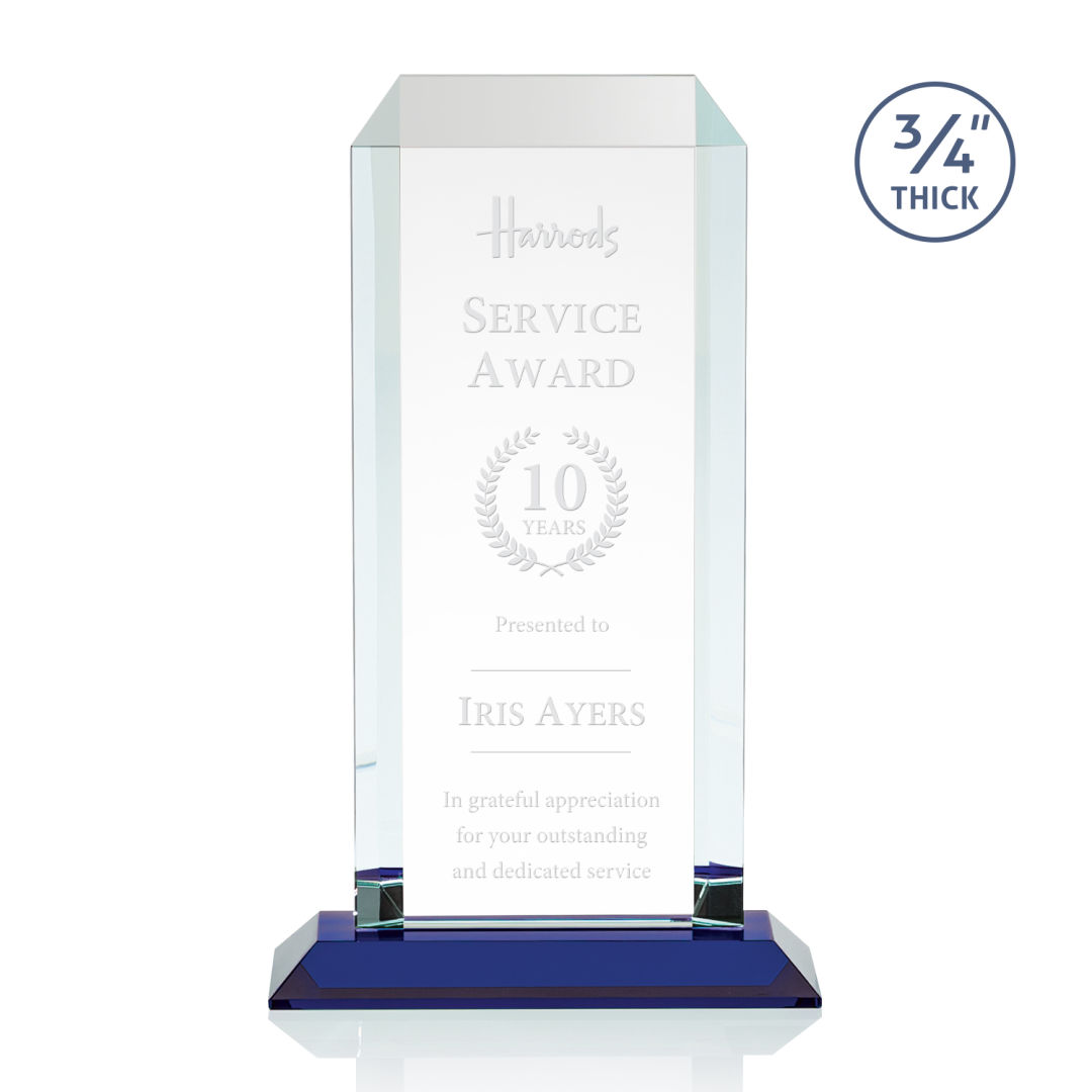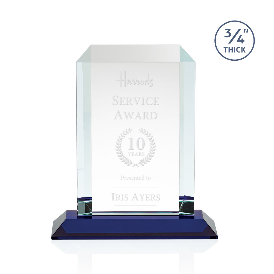 The Dalton Starfire Crystal Award features a thick 3/4″ tower with mitered edges all around that create a sparkling frame for your message of recognition. Available with your choice of 8 distinct and vivid colored bases, the Dalton award radiates light throughout the room and showcases your special achievement. 7.0″ W x 7.75″ H x 3.0″ D