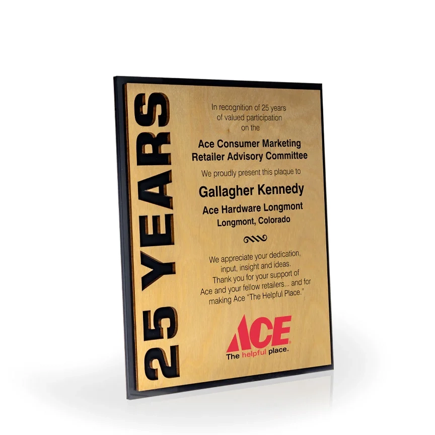 The Decklin Award Plaque is an acrylic plaque with a custom cut, maple finish wood panel attached to the front. This is a unique and budget friendly option for every awards program. This plaque is a standard wall size that measures 8″ x 10″. The Decklin Plaque is designed to hang vertically and can be printed in a variety of colors to match your brand. It is very popular for Years of Service Awards. Available in 5, 10, 15 20, 25 or other custom number cutouts. 10″ H x 8″ W x 3/4″ D
