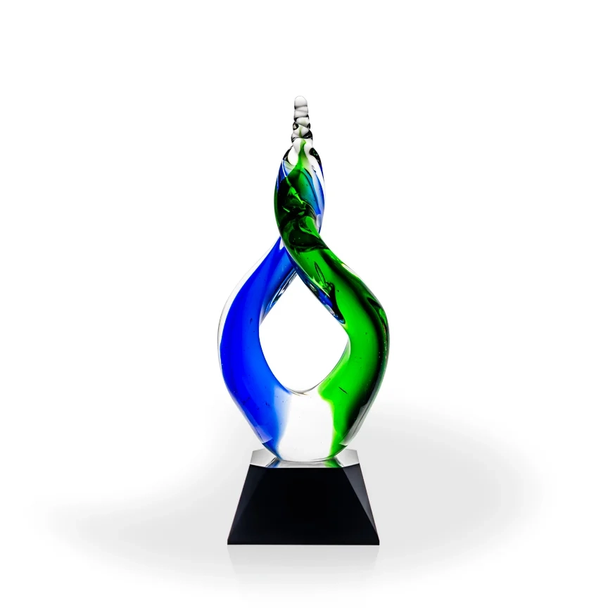 The Delphia Art Glass award is a popular award choice for companies with logos that use the cobalt blue or darker green colors. It is sure to impress your recipients. The Delphia Art Glass Award is set on a black crystal base. The text will be silver filled for readability. Art glass awards are hand blown, and each piece will be slightly different in color, shape, and size. Bubbles and swirls are a part of the process and are considered normal and acceptable. 12″ H x 5″ W x 3.25″ D