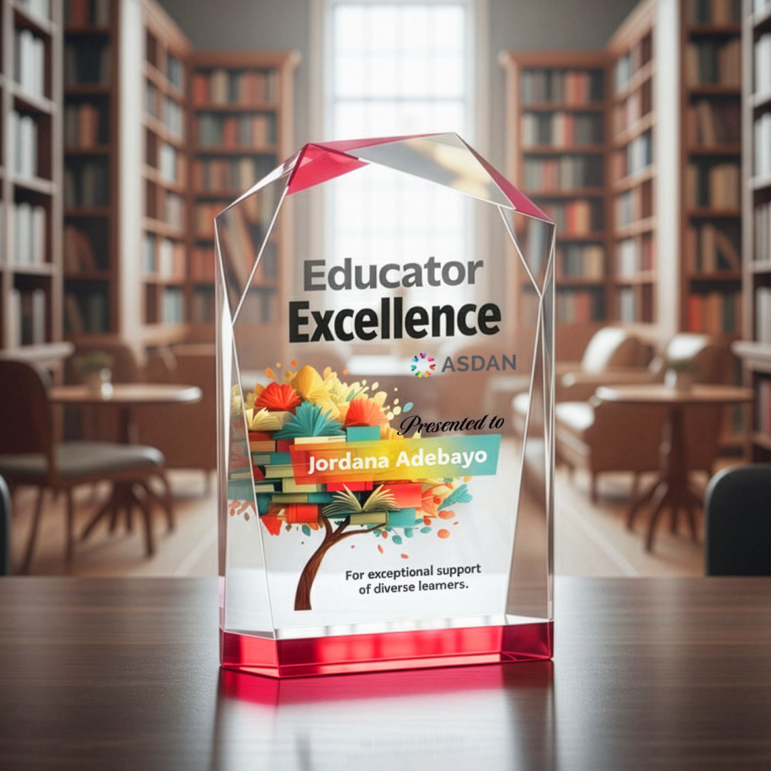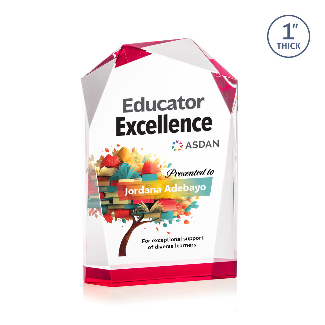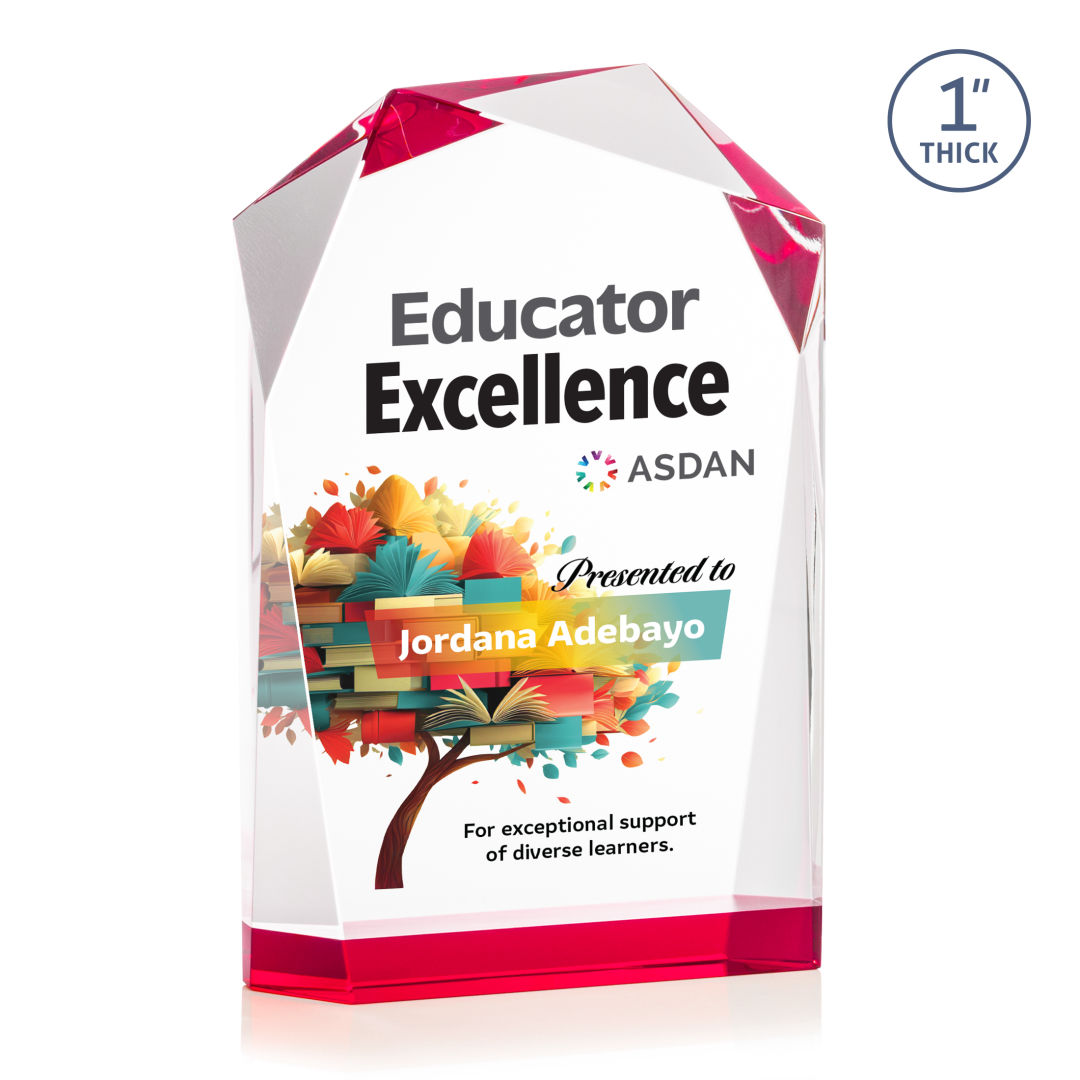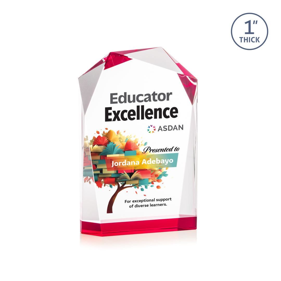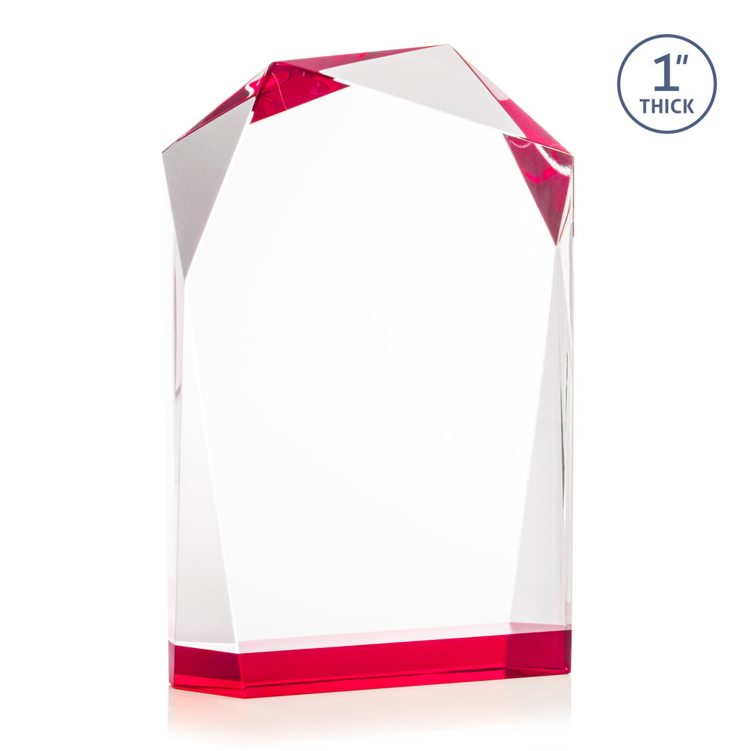 The elegant freestanding Donvale VividPrint™ award features a modern geometric design with beveled edges and a vibrant ruby accent at the base that reflects throughout the top bevels. Crafted from optical crystal, its asymmetrical angles catch the light beautifully, creating a striking visual effect. Available in three sizes, it’s perfect for recognizing excellence with a sophisticated and contemporary touch. Bring your artwork to life with full-color VividPrint™! 4.125″ W x 6.0″ H x 1.125″ D