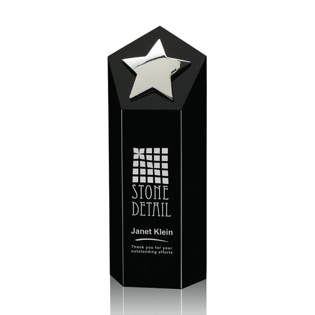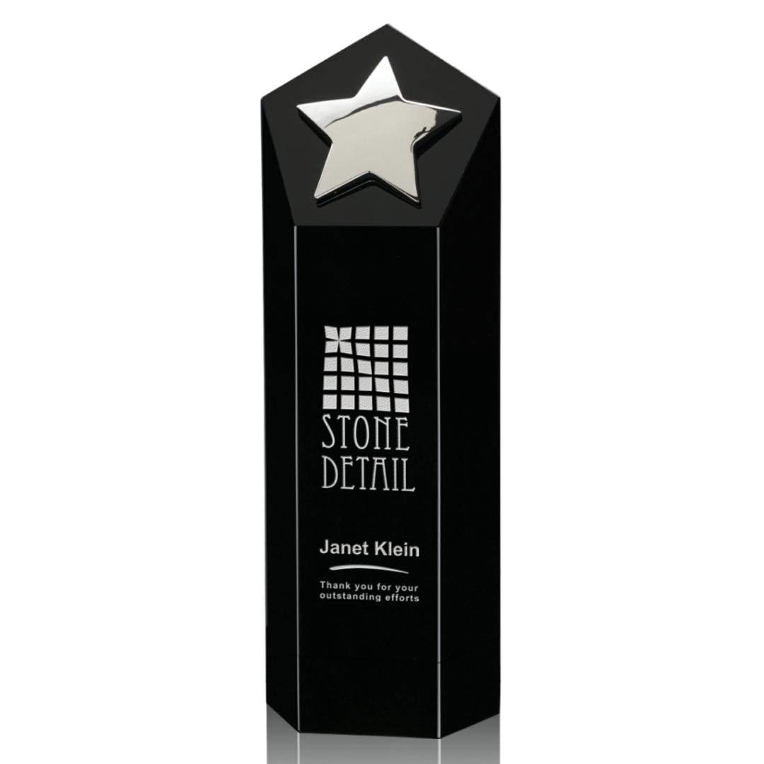 Sleek Black Optical Crystal features a gleaming Silver Cast Metal Star. The perfect award to recognize a Star Performance. Also available in Gold.1 Colorfill Included. 3.0″ W x 6.0″ H x 2.0″ D