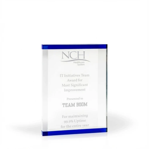The Dory is an elegant and versatile award. Featured here is the Dory with blue accents at the top and at the base of the award. The clear acrylic front of the award offers plenty of space for adding content and logos. Perfect for customizing with any type of recognition. 8″ H x 6″ W x 1.13″ D