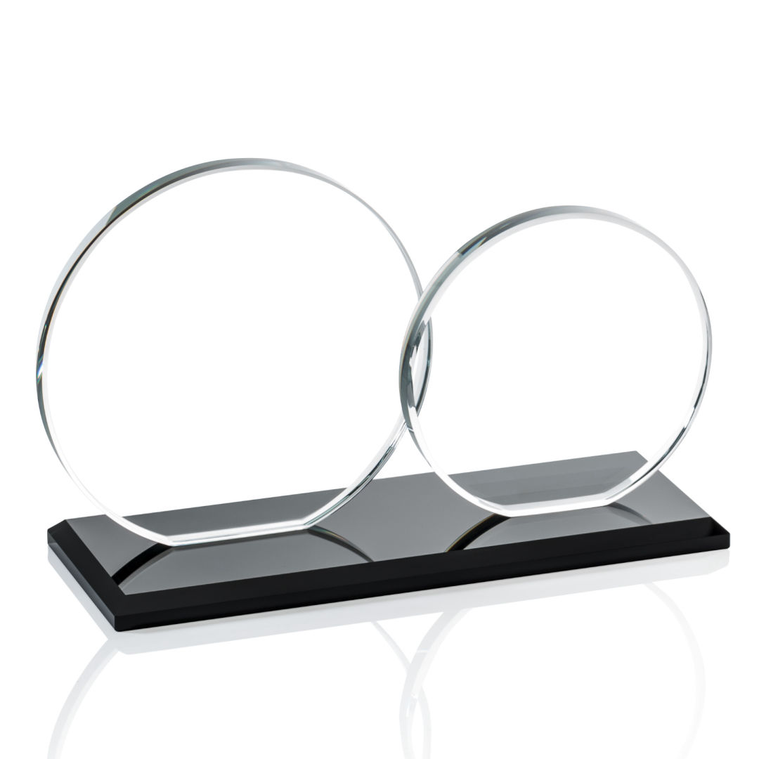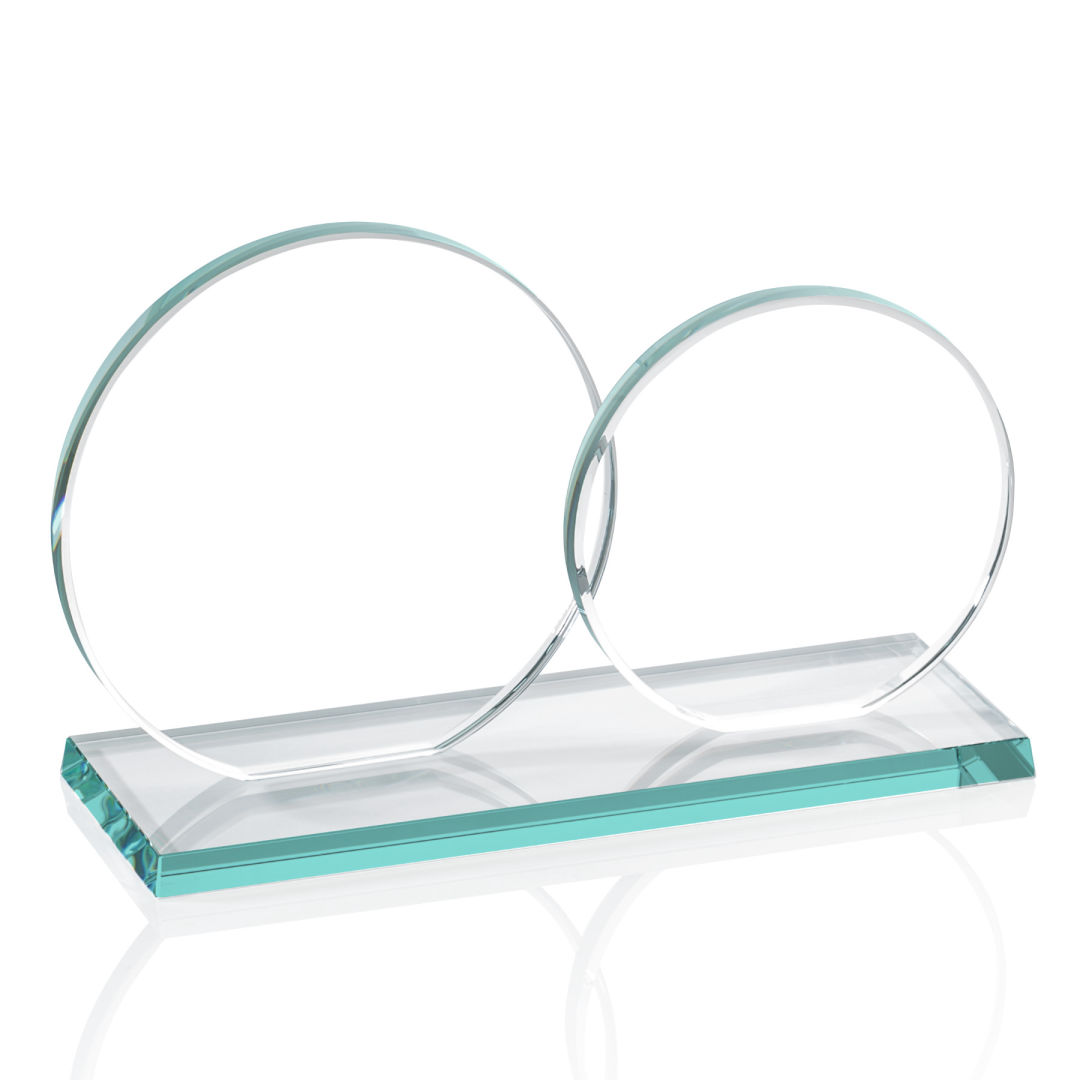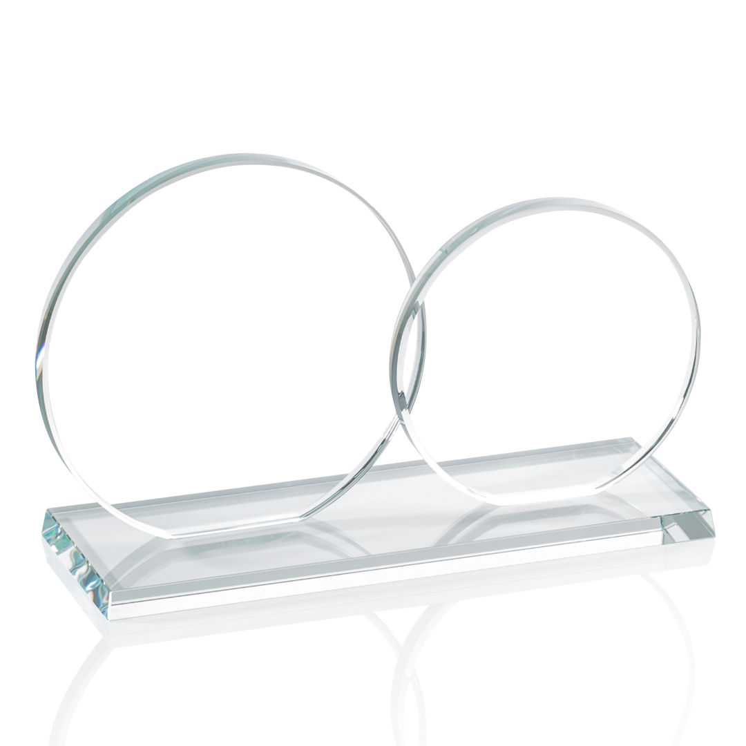 The Double Elgin features two slightly overlapping 3/8″ starfire or jade glass circles (4″ and 5″ in diameter) on a matching clear or colored beveled base. Ideal for messages conveyed as a pair of complementary and perhaps contrasting, pieces of art. 8.0″ W x 5.0″ H