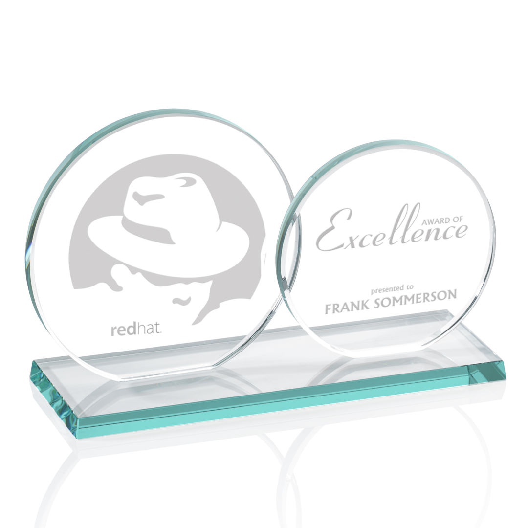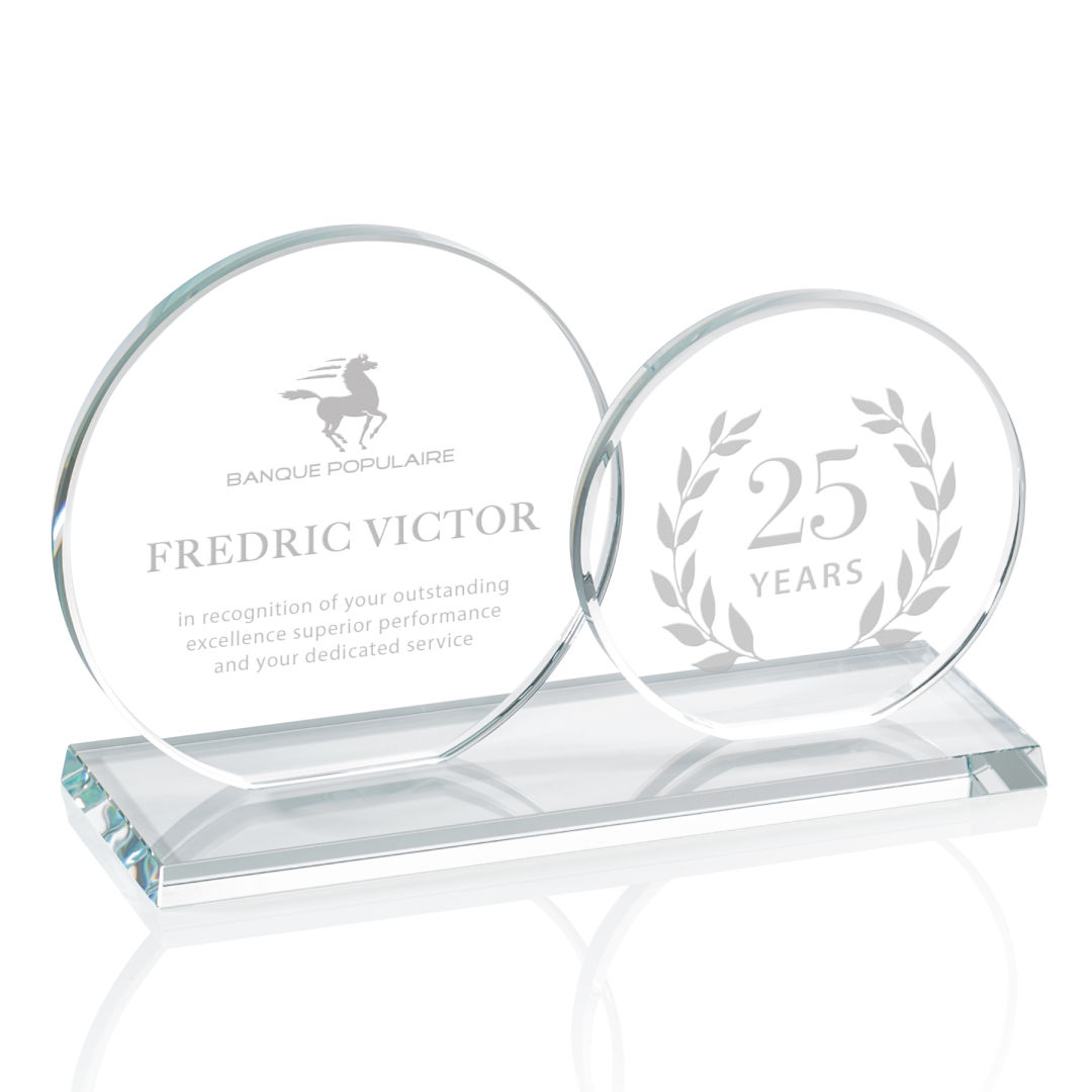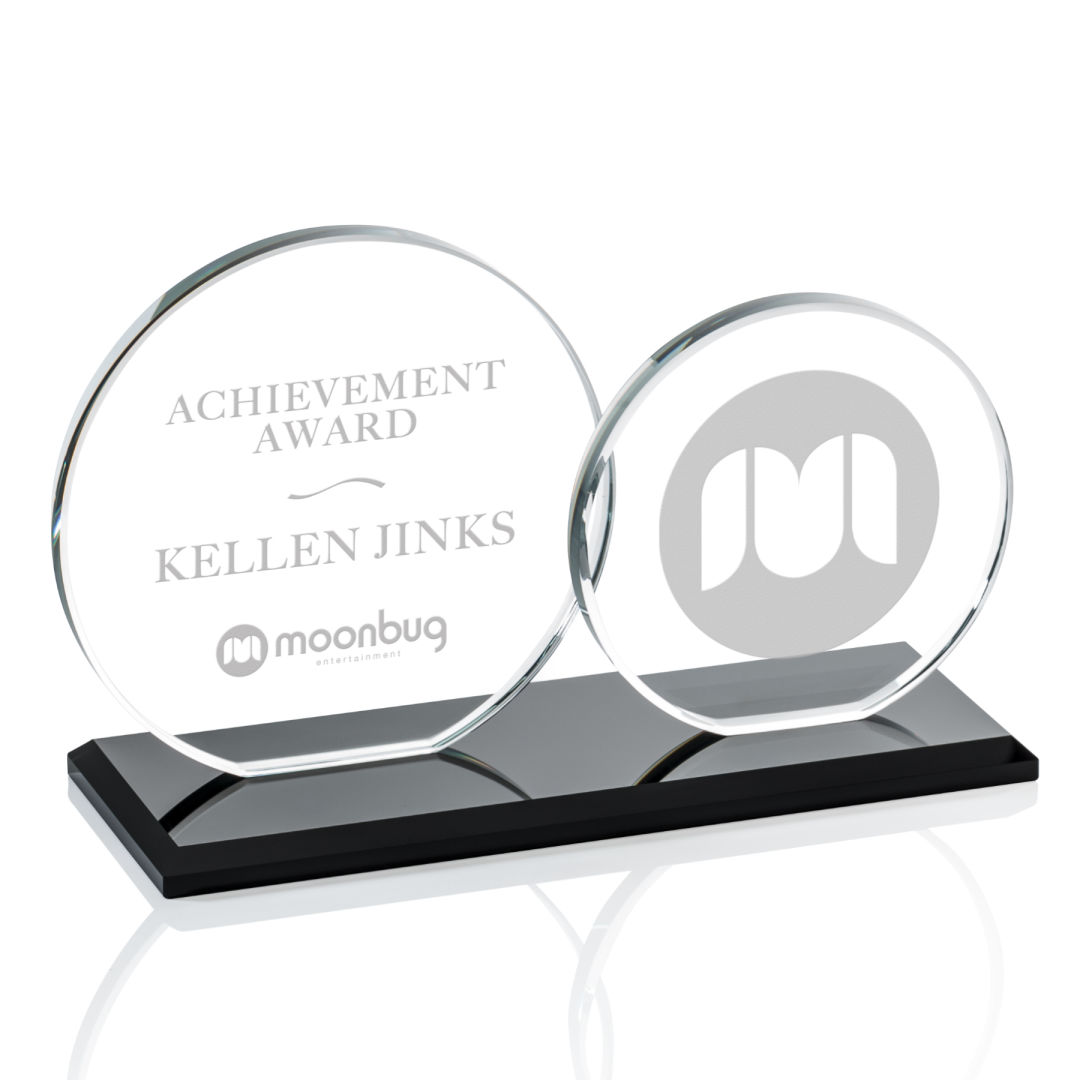 The Double Elgin features two slightly overlapping 3/8″ starfire or jade glass circles (4″ and 5″ in diameter) on a matching clear or colored beveled base. Ideal for messages conveyed as a pair of complementary and perhaps contrasting, pieces of art. 8.0″ W x 5.0″ H